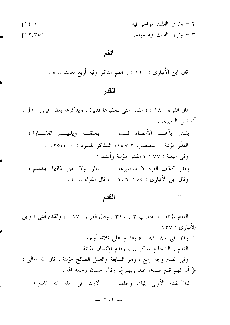 القدم مؤنثة. المقتضب 320:3. قال الفراء: 17: «والقدم أنثى، وابن الأنباري: 137