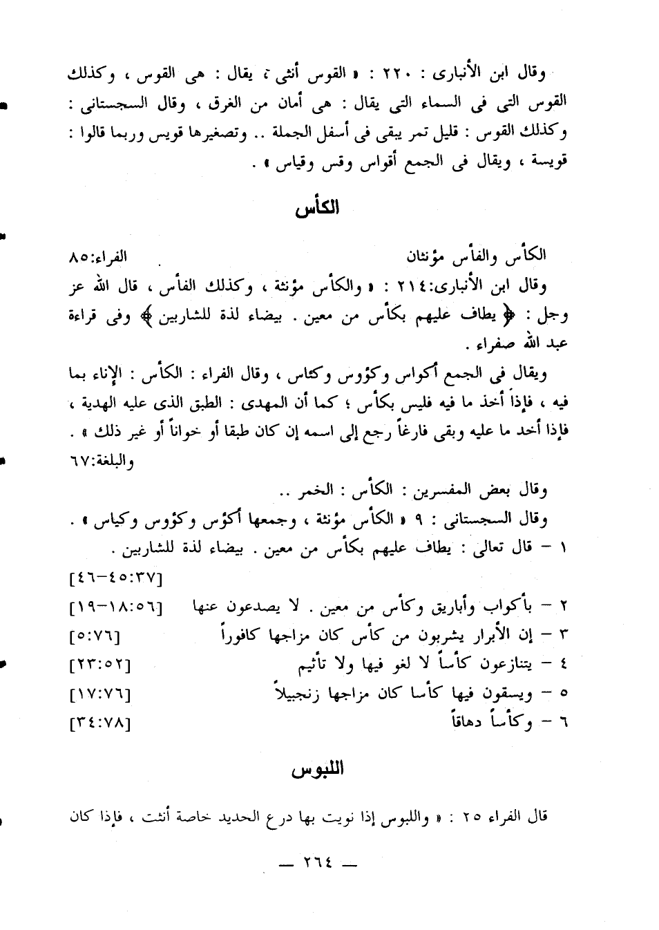 قال ابن الأنباري: 214: «والكأس مؤنثة، وكذلك الفأس، قال الله عز وجل: {يطاف عليهم بكأس من معين. بيضاء لذة للشاربين} وفي قراءة عبد الله صفراء.