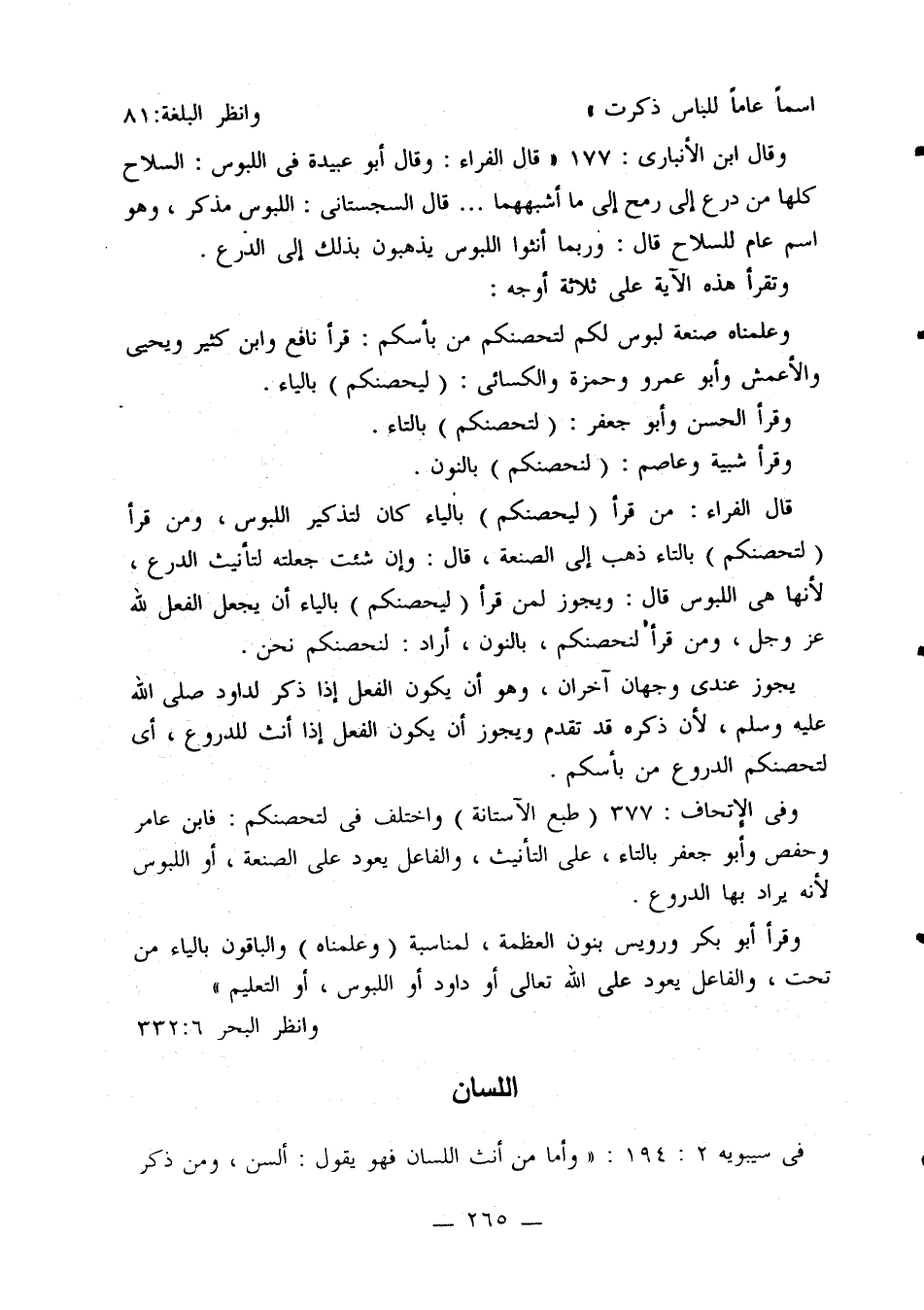 قال ابن الأنباري: 177: «وقال الفراء: وقال أبو عبيدة في اللبوس: السلاح كلها من درع إلى رمح إلى ما أشبهها ... قال السجستاني: اللبوس مذكر، وهو اسم عام للسلاح قال: وربما أنثوا اللبوس يذهبون بذلك إلى الدرع.