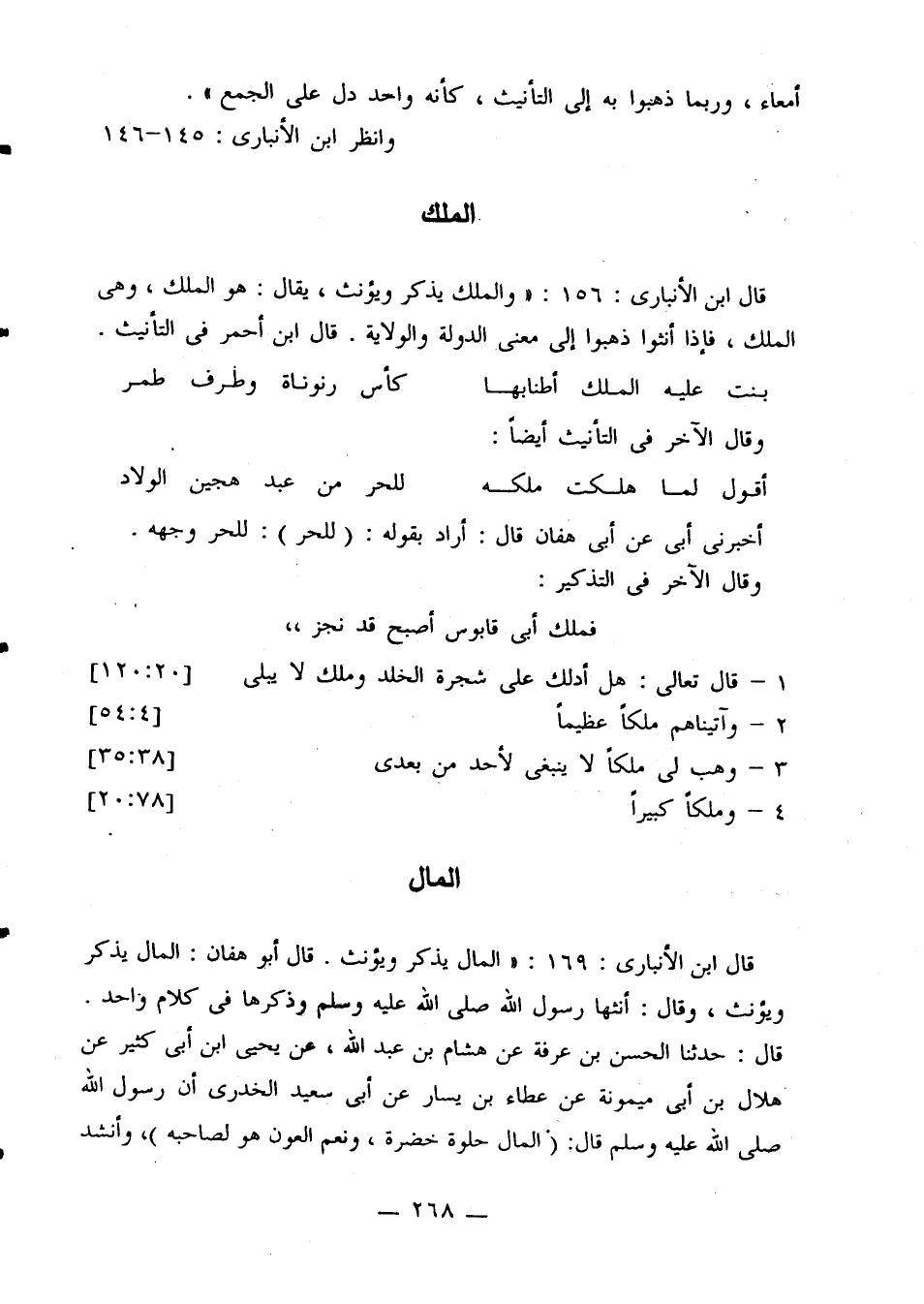 قال ابن الأنباري: 169: «المال يذكر ويؤنث. قال أبو هفان: المال يذكر ويؤنث، وقال: أنثها رسول الله صلى الله عليه وسلم، وذكرها في كلام واحد. قال: حدثنا الحسن بن عرفة عن هشام بن عبد الله، عن يحيى ابن أبي كثير عن هلال بن أبي ميمونة عن عطاء بن يسار عن أبي سعيد الخدري أن رسول الله صلى الله عليه وسلم قال: (المال حلوة خضرة، ونعم العون لصاحبه».، وأنشد