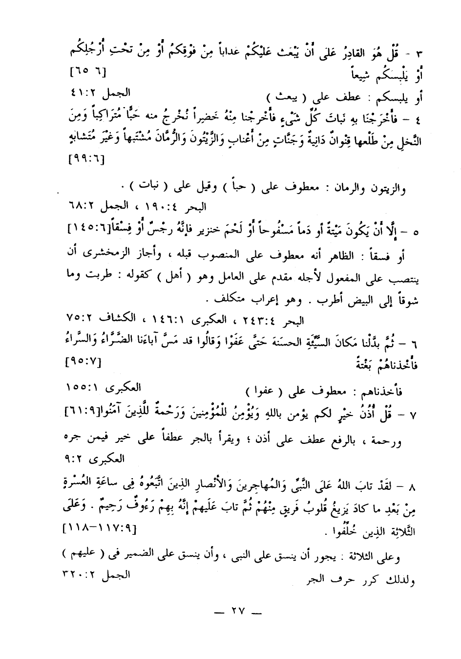 وعلى الثلاثة: يجوز أن ينسق على النبي، وأن ينسق على الضمير في (عليهم) ولذلك كرر حرف الجر. الجمل 320 - 2
