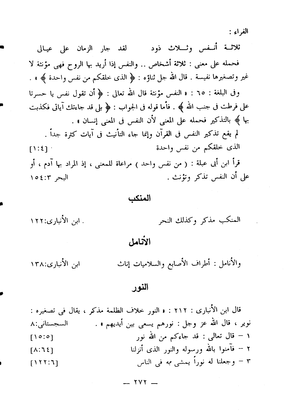 وفي البلغة: 65: «النفس مؤنثة قال الله تعالى: {أن تقول نفس يا حسرتا علي فطرت في جنب الله}. فأما قوله في الجواب: {بلى قد جاءت آياتي فكذبت بها} بالتذكير فحمله على المعنى لأن النفس في المعنى إنسان».