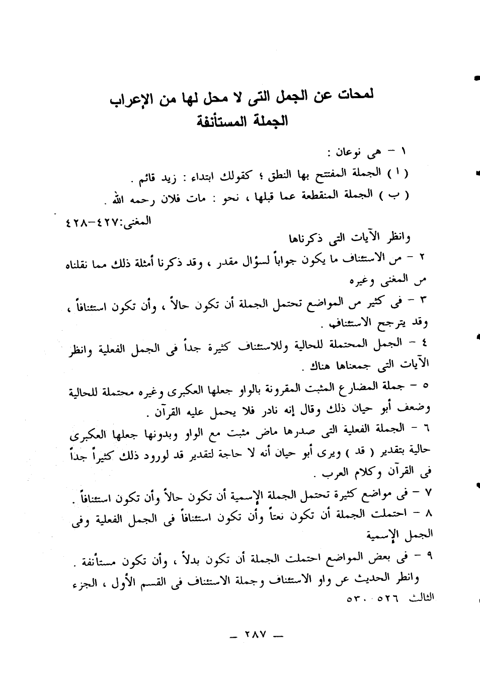(ب) الجملة المنقطعة عما قبلها، نحو: مات فلان رحمه الله. المغني 427 - 428