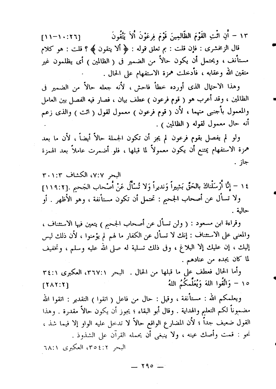وهذا الاحتمال الذي أورده خطأ فاحش، لأنه جعله حالاً من الضمير في الظالمين، وقد أعرب هو (قوم فرعون) عطف بيان، فصار فيه الفصل بين العامل والمعمول بأجنبي منهما، لأن (قوم فرعون) معمول لقول (ائت) والذي زعم أنه حال معمول لقوله (الظالمين).