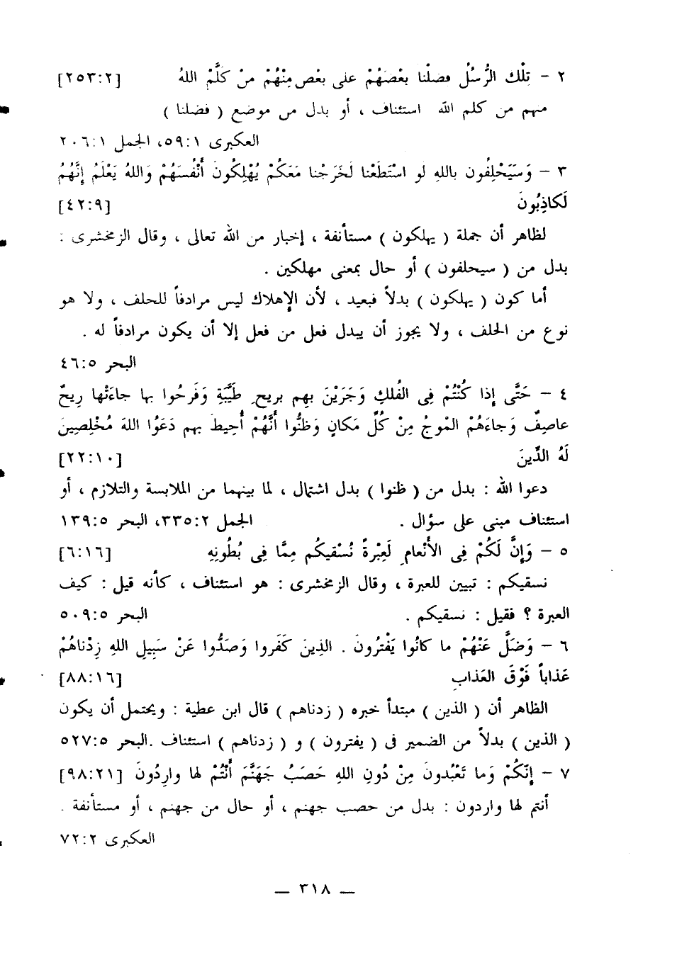 أما كون (يهلكون) بدلاً فبعيد، لأن الإهلاك ليس مرادفًا للحلف، ولا هو نوع من الحلف، ولا يجوز أن يبدل فعل من فعل إلا أن يكون مرادفًا له.