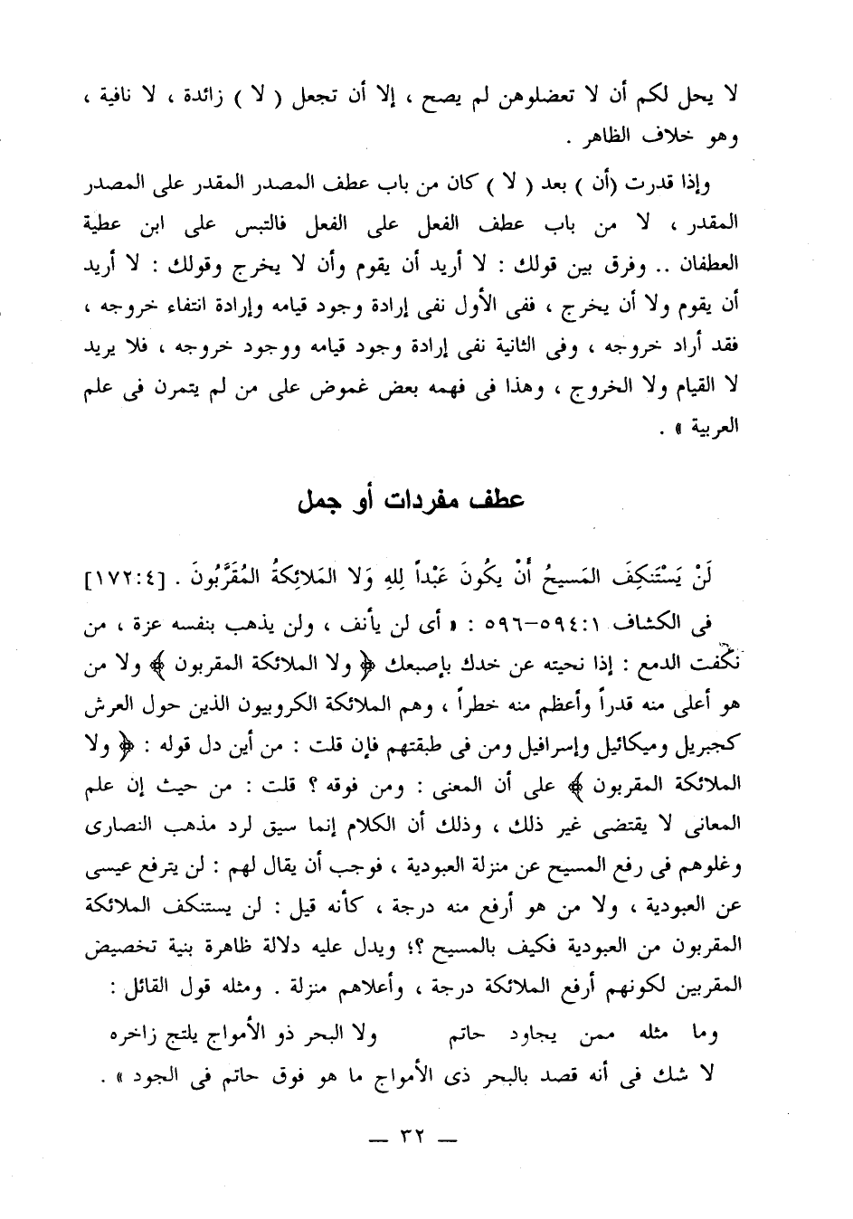 وإذا قدرت (أن) يعد (لا) كان من باب عطف المصدر المقدر على المصدر المقدر، لا من باب عطف الفعل على الفعل فالتبس على ابن عطية العطفان .. وفرق بين قولك: لا أريد أن يقوم وأن لا يخرج وقولك: لا أريد أن يقوم ولا أن يخرج، ففي الأول نفى إرادة وجود قيامه ووجود خروجه، فلا يريد لا القيام ولا الخروج، وهذا في فهمه بعض غموض على من لم يتمرن في علم العربية».