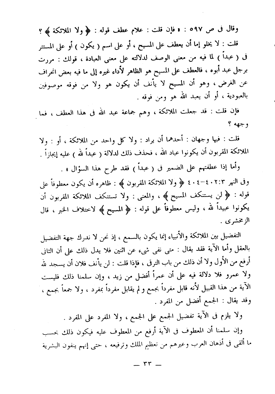وقال في ص 597: «فإن قلت: علام عطف قوله: {ولا الملائكة}؟ قلت: لا يخلو إما أن يعطف على المسيح، أو على اسم (يكون) أو على المستتر في (عبدًا) لما فيه من معنى الوصف لدلالته على معنى العبادة، قولك: مررت برجل عبد أبوه، فالعطف على المسيح هو الظاهر لأداء غيره إلى ما فيه بعض انحراف عن الغرض، وهو أن المسيح لا يأنف أن يكون هو ولا من فوقه موصوفين بالعبودية، أو أن يعبد الله هو ومن فوقه.