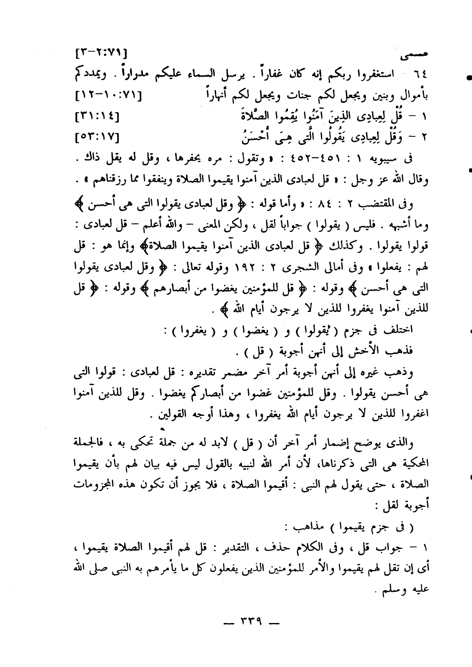 وفي المقتضب 84:2: «وأما قوله: {وقل لعبادي يقولوا التي هي أحسن} وما أشبه. فليس (يقولوا) جوابًا لقل، ولكن المعنى- والله أعلم- قل لعبادي: قولوا يقولوا. وكذلك {قل لعبادي الذين آمنوا يقيموا الصلاة} وإنما هو: قل لهم: يفعلوا» وفي أمالي الشجري 192:2 وقوله تعالى: {وقل لعبادي يقولوا التي هي أحسن} وقوله: {قل للمؤمنين يغضوا من أبصارهم} وقوله: {قل للذين آمنوا يغفر للذين لا يرجون أيام الله}.