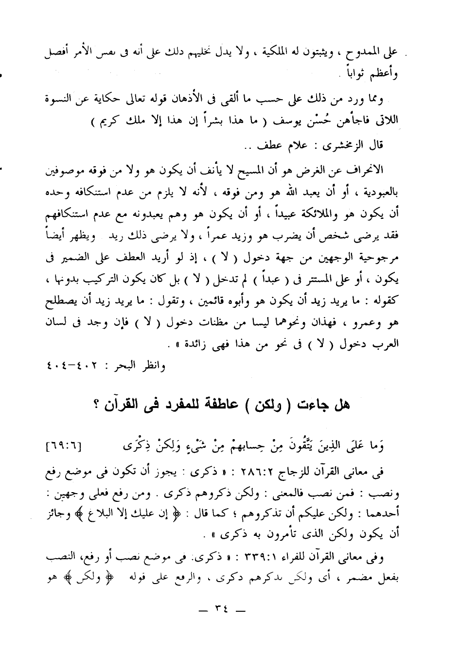 الانحراف عن الغرض هو أن المسيح لا يأنف أن يكون هو ولا من فوقه موصوفين بالعبودية، أو أن يعبد الله هو ومن فوقه، لأنه لا يلزم من عدم استنكافه وحده أن يكون هو والملائكة عبيدًا، أو أن يكون هو وهم يعبدونه مع عدم استنكافهم فقد يرضى شخص أن يضرب هو وزيد عمرًا، ولا يرضى ذلك زيد. ويظهر أيضًا مرجوحية الوجهين من جهة دخول (لا)، إذ لو أريد العطف على الضمير في يون، أو على المستتر في (عبدًا) لم تدخل (لا) بل كان يكون التركيب بدونها، كقوله: ما يريد زيد أن يكون هو وأبوه قائمين، وتقول: ما يريد زيد أن يصطلح هو وعمرو، فهذان ونحوهما ليسا من مظنات دخول (لا) فإن وجد في لسان العرب دخول (لا) في نحو من هذا فهي زائدة».