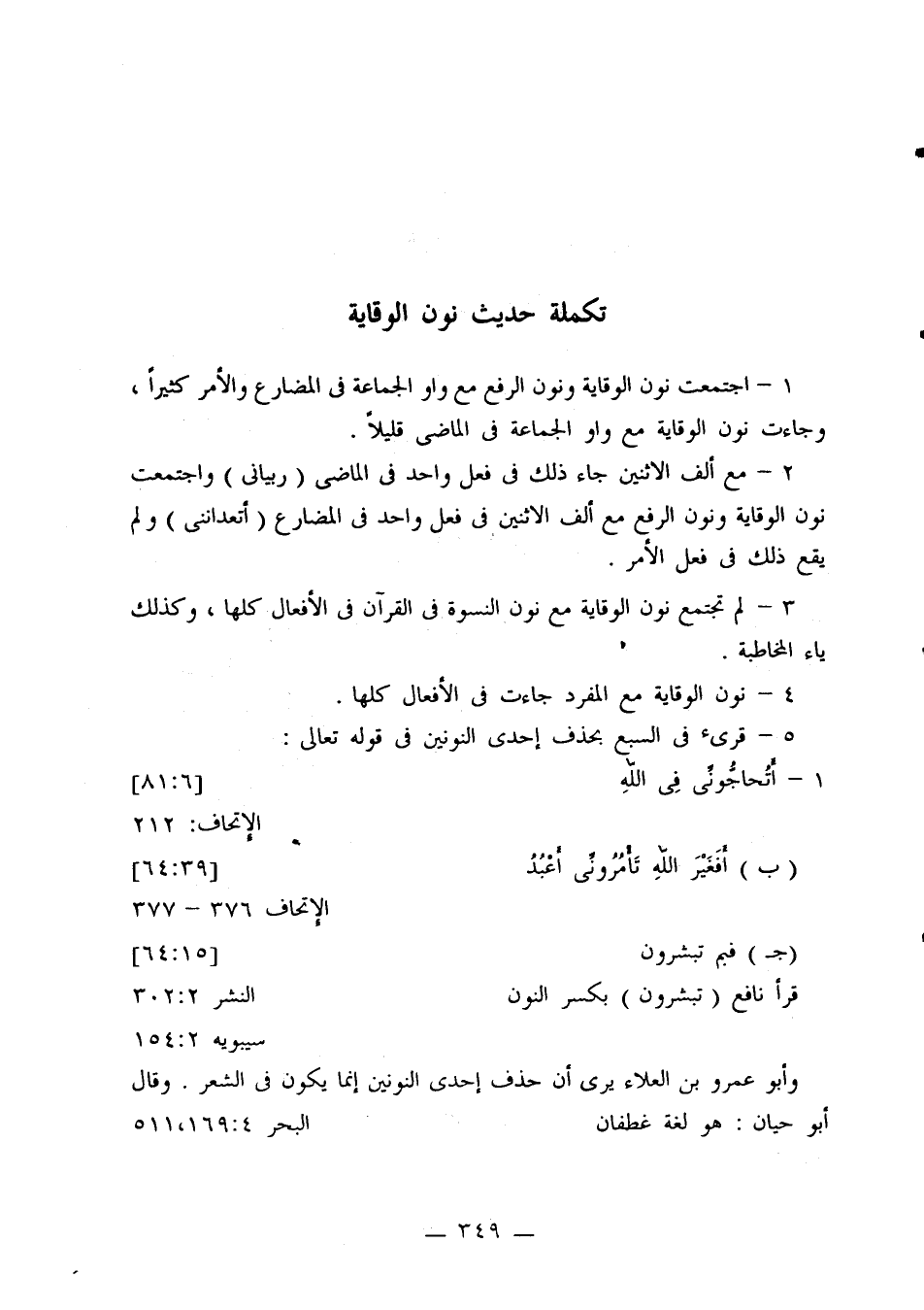 3 - لم تجتمع نون الوقاية مع نون النسوة في القرآن في الأفعال كلها، وكذلك ياء المخاطبة.