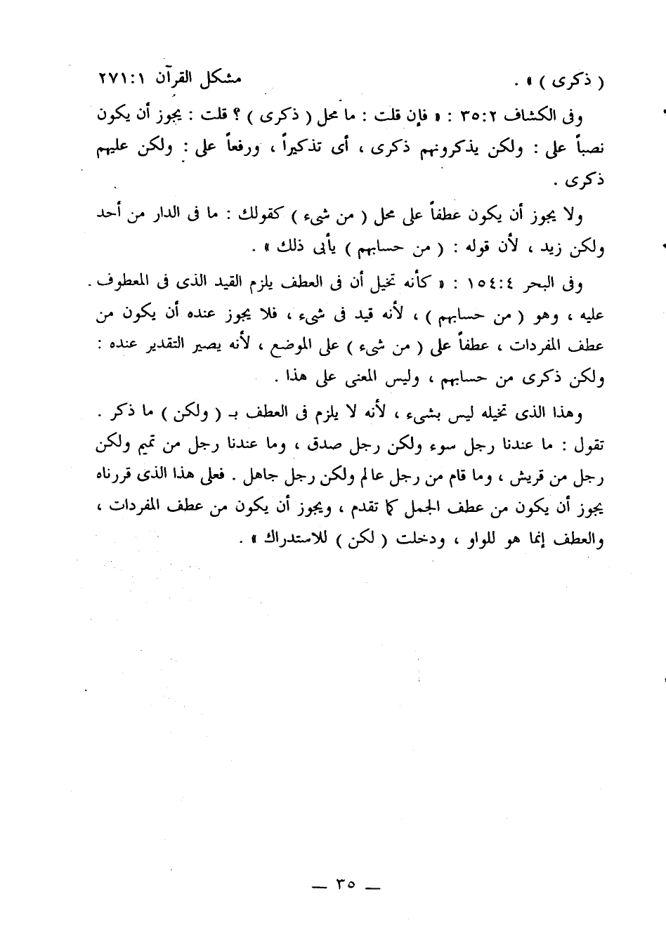 وفي البحر 154:4: «كأنه تخيل أن في العطف يلزم القيد الذي في المعطوف عليه، وهو (من حسابهم)، لأنه قيد في شيء، فلا يجوز عنده أن يكون من عطف المفردات، عطفًا على (من شيء) على الموضع، لأنه يصير التقدير عنده: ولكن ذكرى من حسابهم، وليس المعنى على هذا.