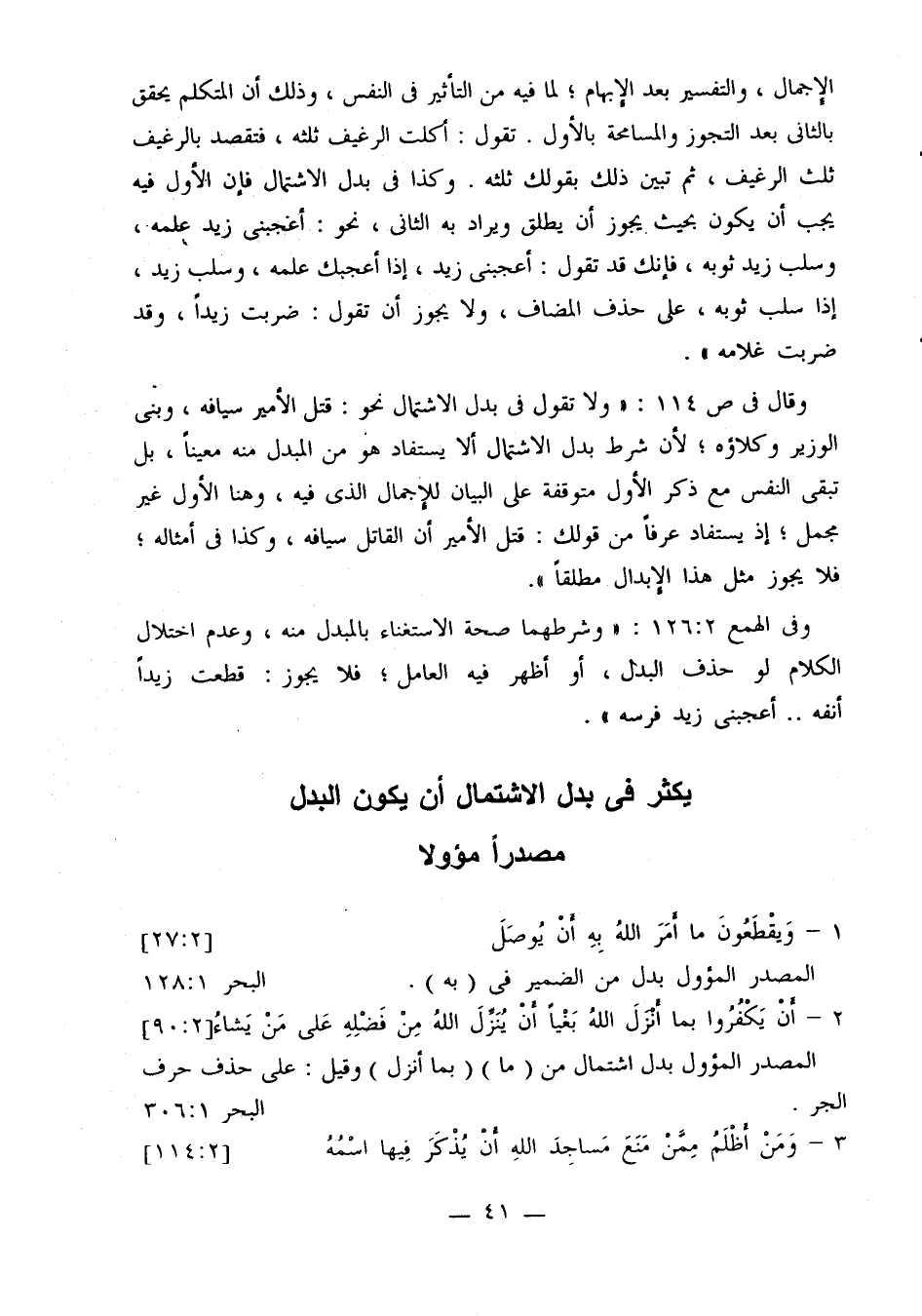 وقال في ص 114: «ولا تقول في بدل الاشتمال نحو: قتل الأمير سيافه، وبنى الوزير وكلاؤه؛ لن شرط بدل الاشتمال ألا يستفاد هو من المبدل منه معينًا، بل تبقى النفس مع ذكر الأولى متوقفة على البيان للإجمال الذي فيه، وهنا الأول غير مجمل؛ إذ يستفاد عرفًا من قولك: قتل الأمير أن القاتل سيافه، وكذا في أمثاله؛ فلا يجوز مثل هذا الا بدال مطلقًا».