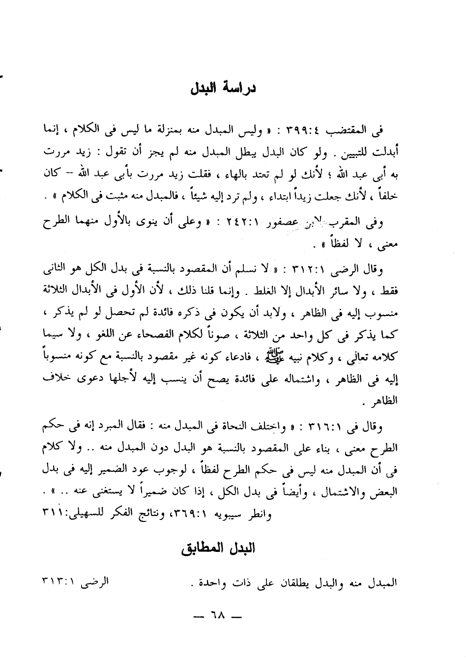 وقال في 316:1: «واختلف النحاة في المبدل منه: فقال المبرد إنه في حكم الطرح معنى، بناء على المقصود بالنسبة هو البدل دون المبدل منه .. ولا كلام في أن المبدل منه ليس في حكم الطرح لفظًا، لوجوب عود الضمير إليه في بدل البعض والاشتمال، وأيضًا في بدل الكل، إذا كان ضميرًا لا يستغنى عنه ..»