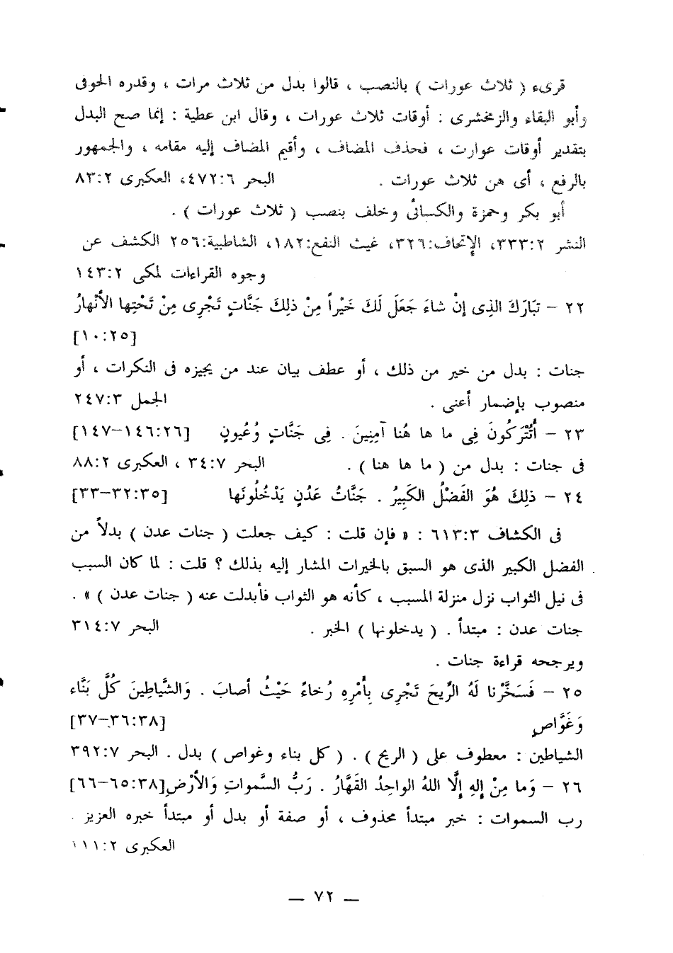 في الكشاف 613:3: «فإن قلت: كيف جعلت (جنات عدن) بدلاً من الفضل الكبير الذي هو السبق بالخيرات المشار إليه بذلك؟ قلت: لما كان السبب في نيل الثواب نزل منزلة السبب، كأنه هو الثواب فأبدلت عنه (جنات عدن)».