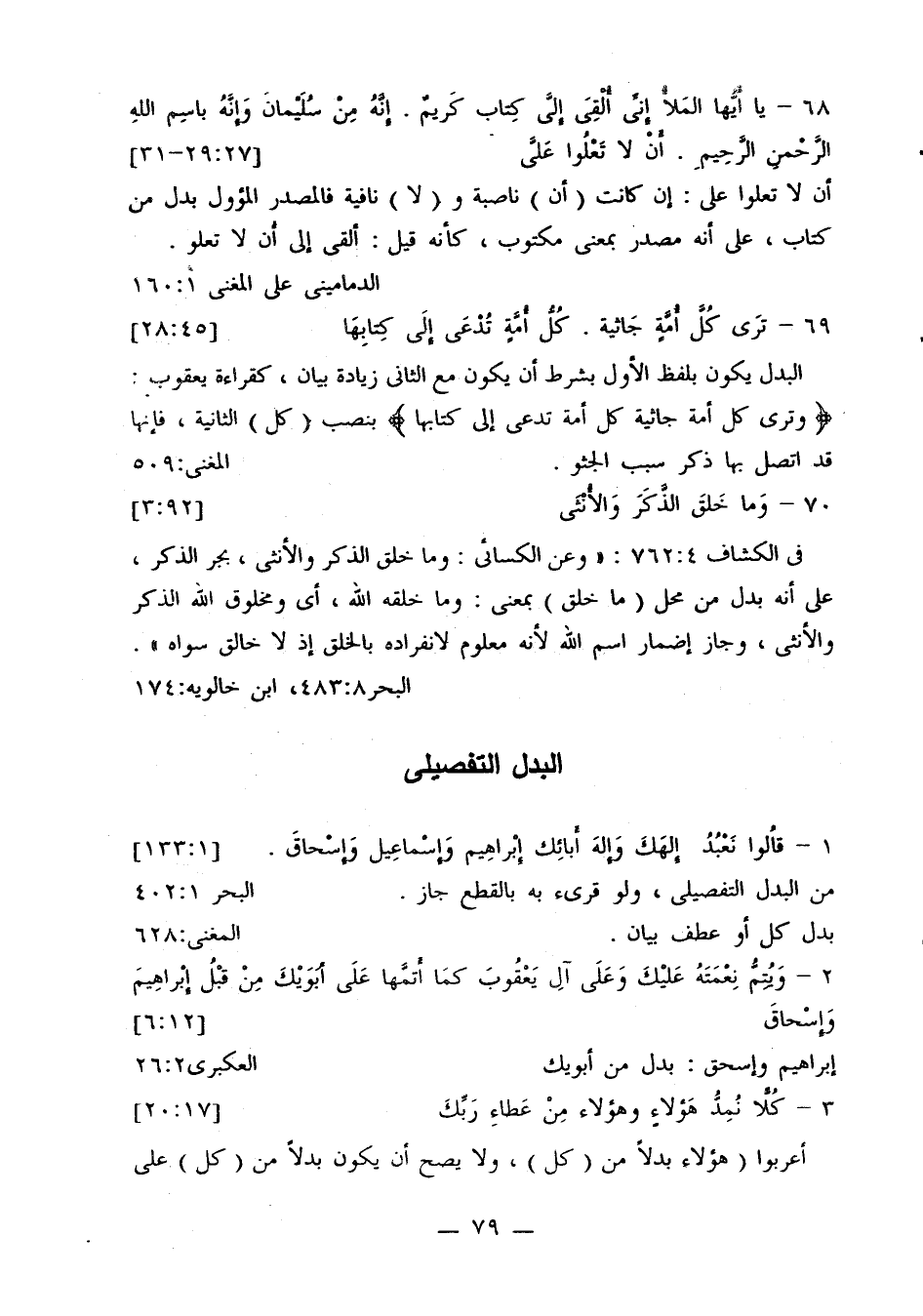 البدل يكون بلفظ الأول بشرط أن يكون مع الثاني زيادة بيان، كقراءة يعقوب: {وترى كل أمة جاثية كل أمة تدعى إلى كتابها} بنصب (كل) الثانية، فإنها قد اتصل بها ذكر سبب الجثو. المغنى: 509