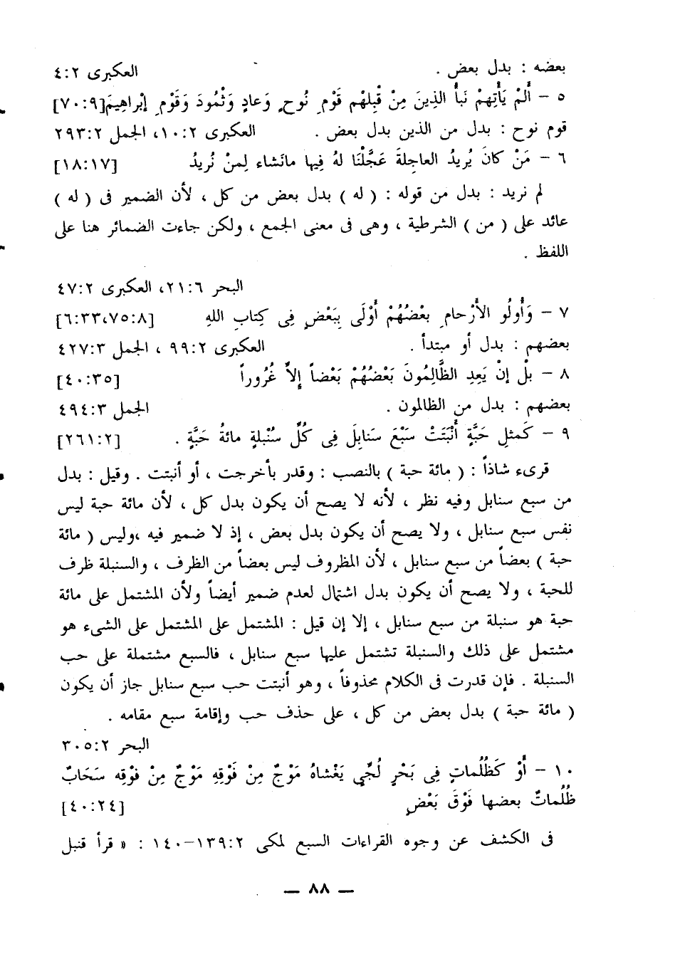 قرئ شاذاً: (مائة حبة) بالنصب: وقدر بأخرجت، أو أنبتت. وقيل: بدل من سبع سنابل وفيه نظر، لأن لا يصح أن يكون بدل كل، لأن مائة حبة ليس نفس سبع سنابل، ولا يصح أن يكون بدل بعض، إذ لا ضمير فيه، وليس (مائة حبة) بعضاً من سبع سنابل، لأن المظروف ليس بعضاً من الظرف، والسنبلة ظرف للحبة، ولا يصح أن يكون بدل اشتمال لعدم ضمير أيضاً ولأن المشتمل على مائة حبة هو سنبلة من سبع سنابل، إلا إن قيل: المشتمل على المشتمل على الشيء هو مشتمل على ذلك والسنبلة تشتمل عليها سبع سنابل، فالسبع مشتملة على حب السنبلة. فإن قدرت في الكلام محذوفاً، وهو أنبتت حب سبع سنابل جاز أن يكون (مائة حبة) بدل بعض من كل، على حذف حب وإقامة سبع مقامه.