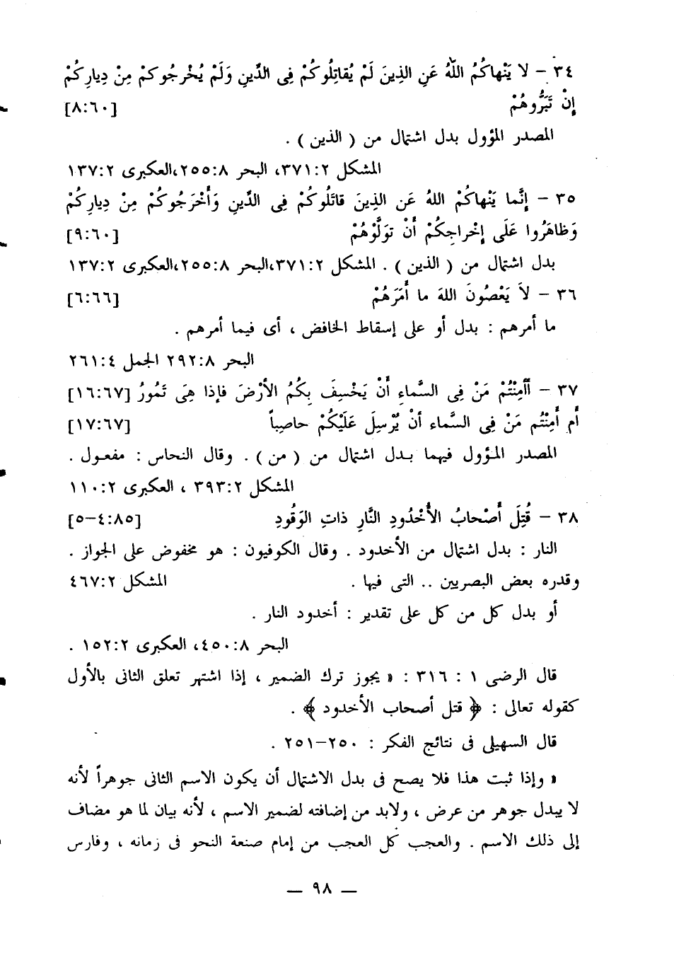 «وإذا ثبت هذا فلا يصح في بدل الاشتمال أن يكون الاسم الثاني جوهرًا لأنه لا يبدل جوهر من عرض، ولا بد من إضافته لضمير الاسم، لأنه بيان لما هو مضاف إلى ذلك الاسم. والعجب كل العجب من إمام صنعه النحو في زمانه، وفارس