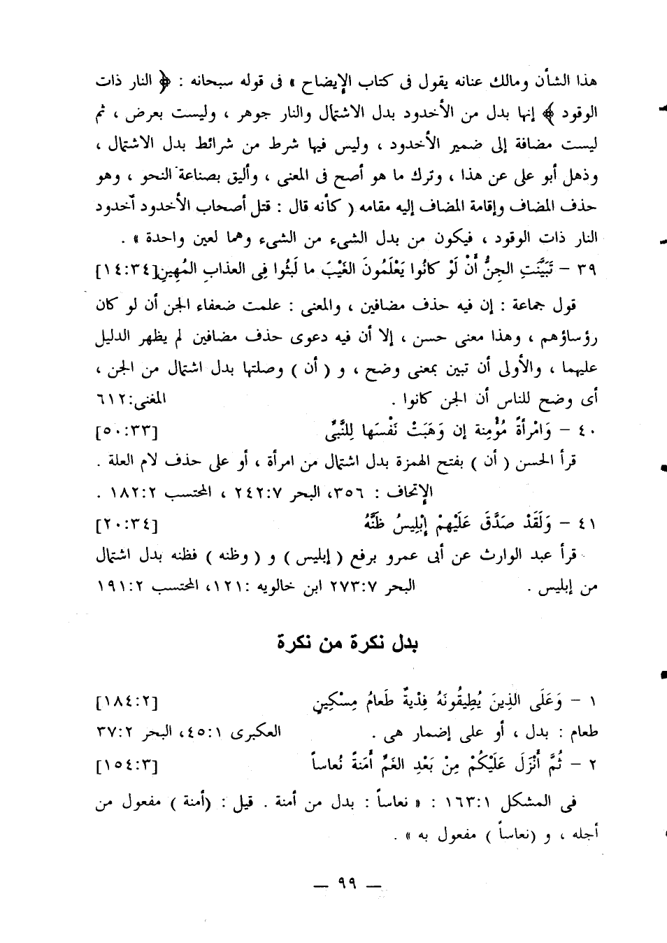 هذا الشأن ومالك عنانه يقول في كتاب الإيضاح» في قوله سبحانه: {النار ذات الوقود} إنها بدل من الأخدود بدل الاشتمال والنار جوهر، وليست بعرض، ثم ليست مضافة إلى ضمير الأخدود، وليس فيها شرط من شرائط بدل الاشتمال، وذهل أبو علي عن هذا، وترك ما هو أصح في المعنى، وأليق بصناعة النحو، وهو حذف المضاف وإقامة المضاف إليه مقامه (كأنه قال: قتل أصحاب الأخدود أخدود النار ذات الوقود، فيكون من بدل الشيء من الشيء وهما لعين واحدة».