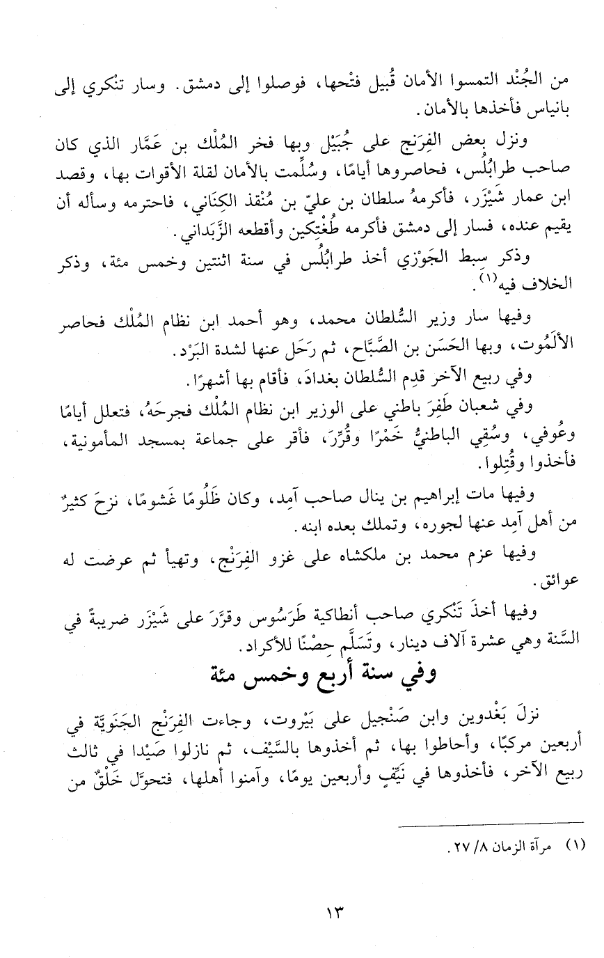 وسار طائفة مِن الشّام إلى بغداد يستنفرون النّاس، واجتمع عليهم خلْق مِن الفُقهاء والمطّوّعة، واستغاثوا وكسروا منبر جامع السّلطان، فوعدهم السّلطان بالجهاد، ثمّ كثُروا وفعلوا أبلغ مِن ذَلِكَ بكثير في جامع القصر، وكثُر الضّجيج، وبَطَلت الجمعة، فأخذ السلطان في أهبة الجهاد.