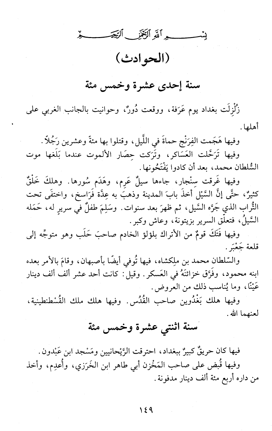 زُلْزِلَت بغداد يوم عَرَفَة، ووقعت دُورٌ وحوانيت بالجانب الغربي على أهلها.