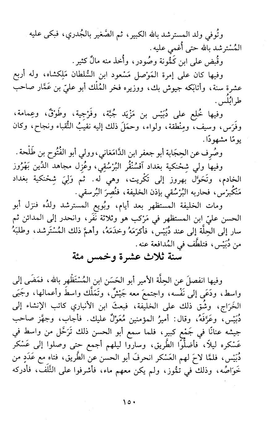 فلمّا سَمِعَ أبو الحَسَن ذلك ترحّل مِن واسط في عسكره ليلًا، فأضلُّوا الطّريق، وساروا ليلهم أجمع حتّى وصلوا إلى عسكر دُبَيْس. فلمّا لاح لهم العسكر انحرف أبو الحَسَن عَنِ الطّريق، فتاه مَعَ عددٍ مِن خواصّه، وذلك في تمّوز. ولم يكن معهم ماء، فأشرفوا عَلَى التلف، فأدركه -[151]- نصر بْن سَعْد الكرديّ، فسقاه، وعادت نفسُه إِليْهِ، ونهب ما كَانَ معه مِن مال، وحمله إلى دُبَيْس إلى النعمانية، فأقدمه إلى بغداد وخيّم بالرَّقَّة.