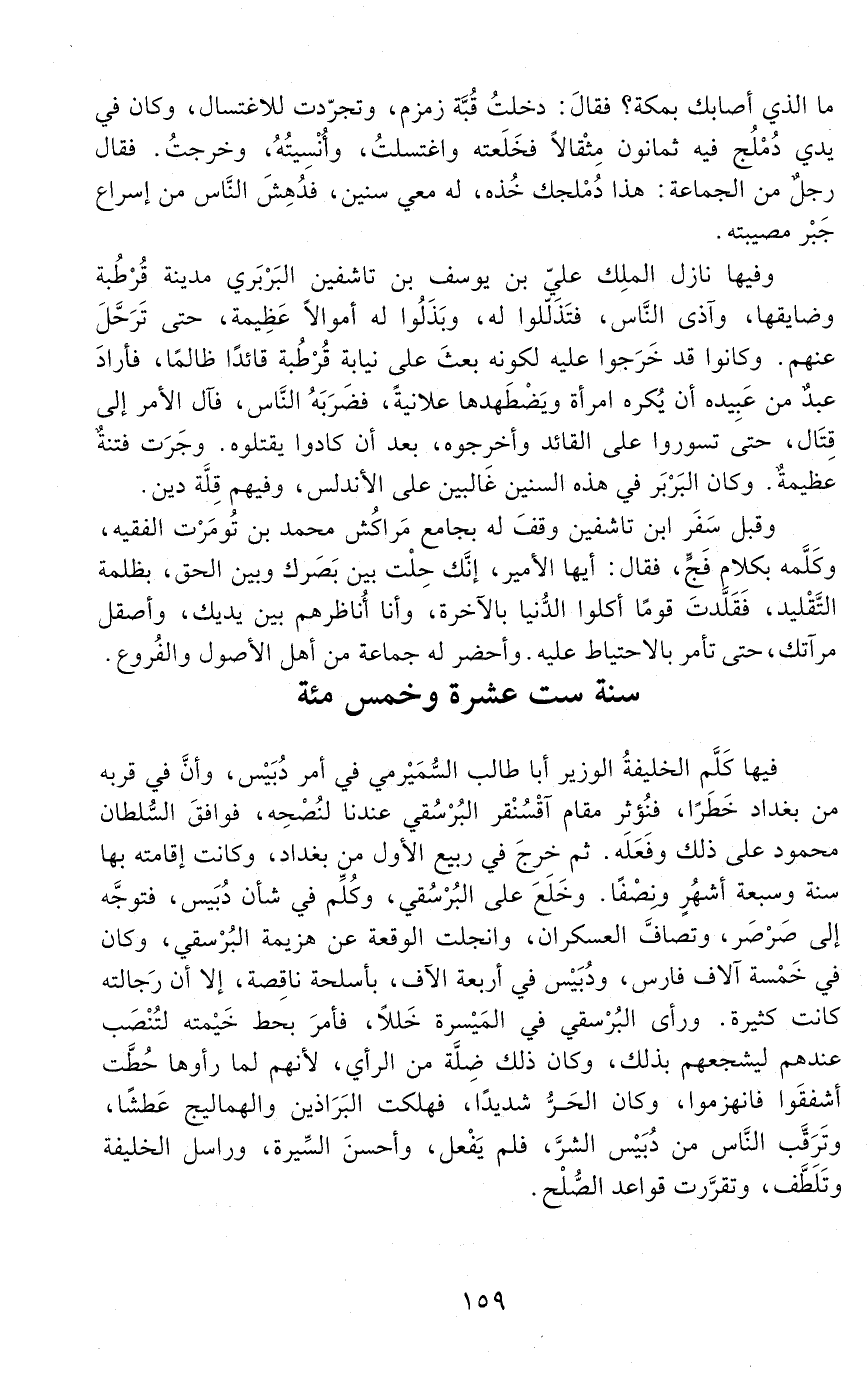 فيها كلّم الخليفة الوزير أبا طَالِب السّميرميّ في أمر دبيس، وأن في قربه مِن بغداد خطرًا، فنؤثر مقام أقسُنْقُر البُرْسُقيّ عندنا لنُصْحه، فوافق السّلطان محمود عَلَى ذَلِكَ وفعله.