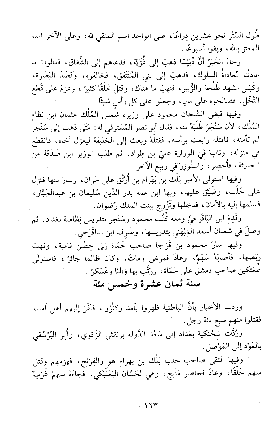 وفيها أخذ جماعة من الباطنية كانوا قدموا في قافلة، فقتلوا ببغداد، قِيلَ: جاءوا لقتل الوزير ابن صَدَقة والأمير نظر، وأُخذ في الجملة ابن أيّوب قاضي عكبرا ونهبت داره، فقيل: كانت عنده مدارج مِن كُتُب الباطنيّة، وأخذ آخر كان يعينهم بالمال.