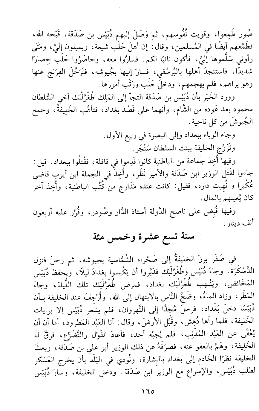 ودخل الخليفة، وسار دُبَيْس -[166]- وطُغْرُلْبَك إلى سَنْجَر مستجيرين بِهِ، هذا مِن أخيه محمود، وهذا من الخليفة، فأجارهما، ولبسا عَليْهِ، فقالا: قد طَرَدنا الخليفة، وقال: هذه البلاد لي، فقبض سنجر على دبيس وسجنه خدمة للخليفة.