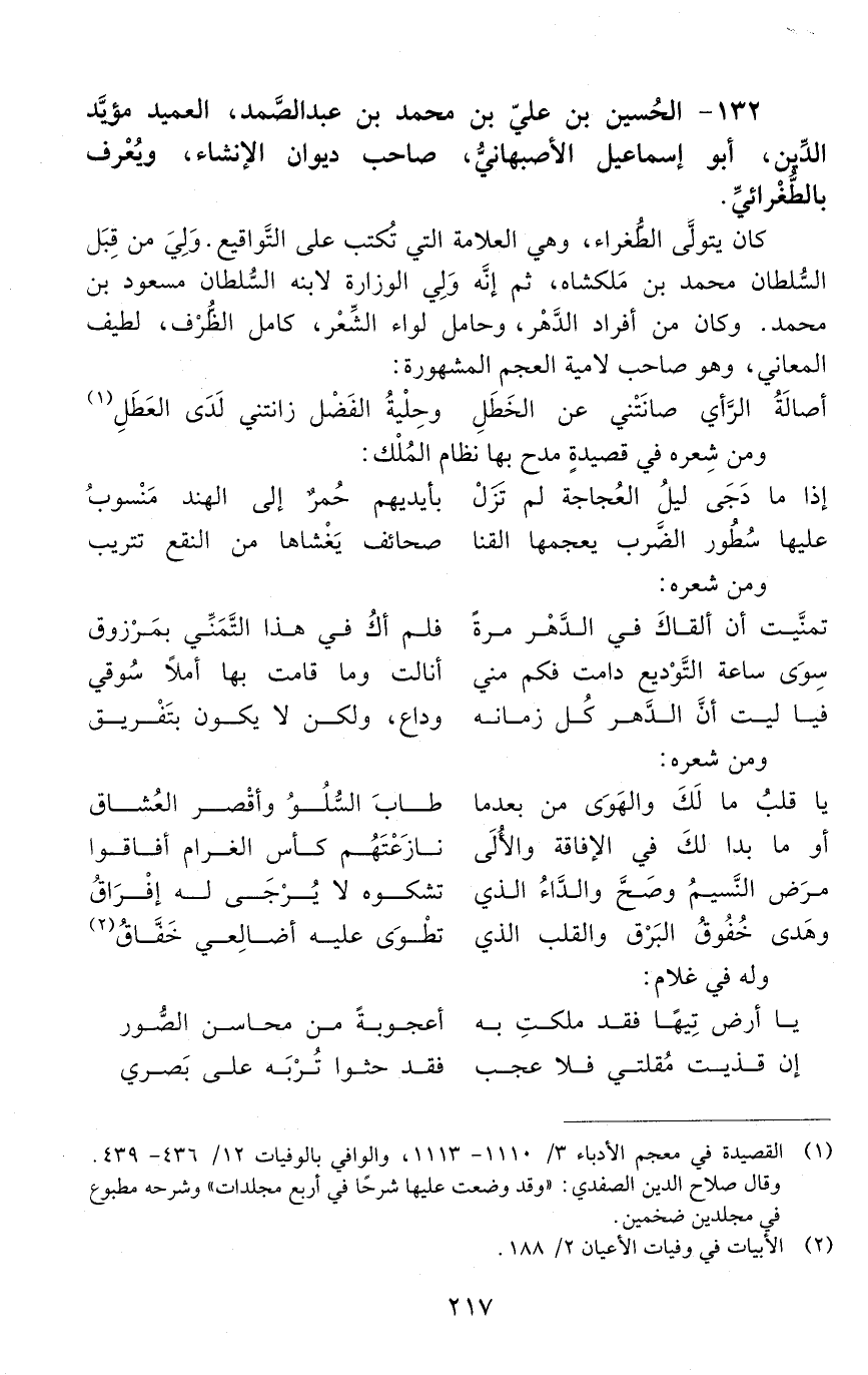132 - الحسين بن علي بن محمد بن عبد الصّمد، العميد مؤيَّد الدّين، أبو إسماعيل الإصبهاني، صاحب ديوان الإنشاء، ويُعرف بالطُّغْرائيّ. [المتوفى: 514 هـ]