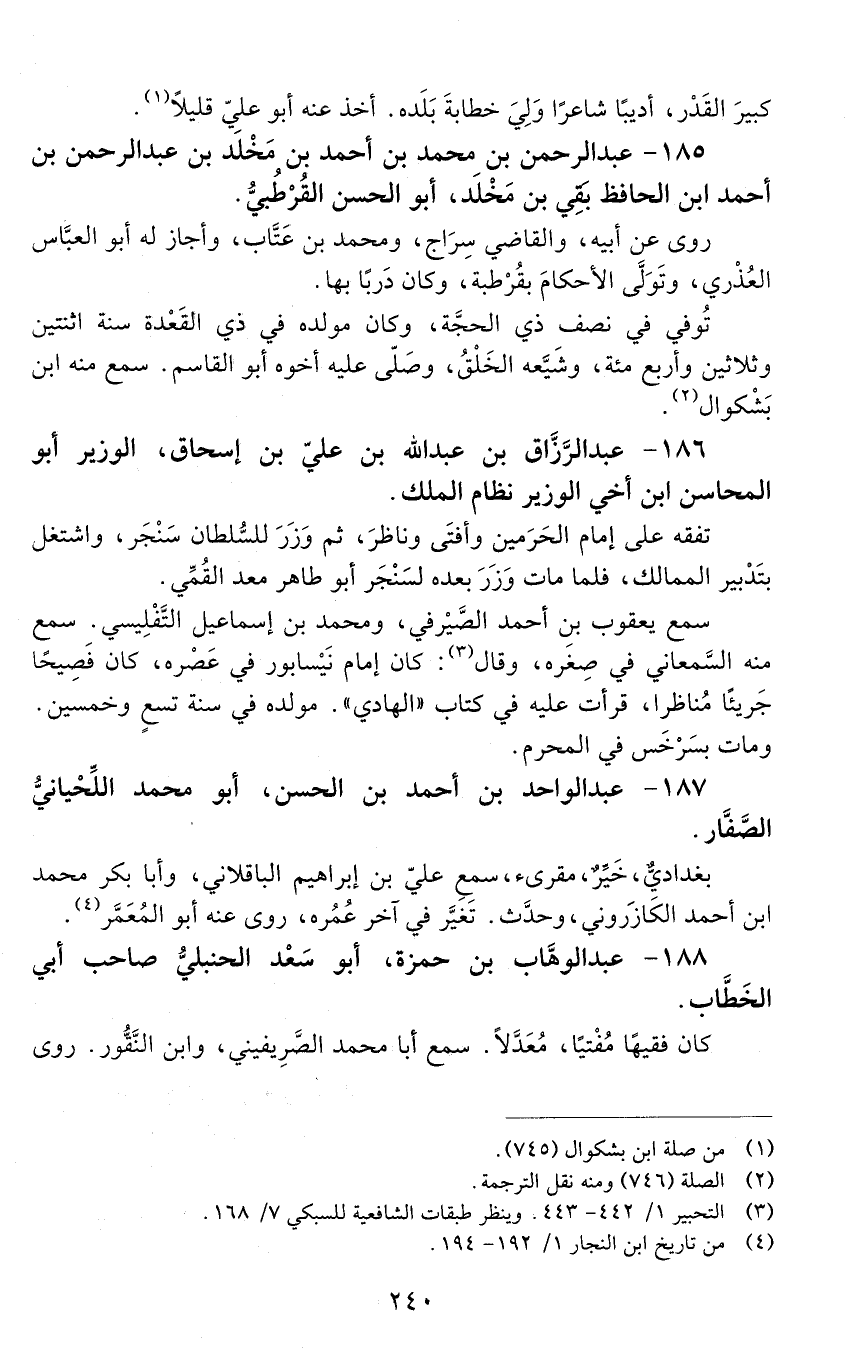 185 - عَبْد الرَّحْمَن بْن محمد بْن أَحْمَد بْن مَخْلَد بن عبد الرحمن بن أحمد ابن الحافظ بقي بن مخلد، أبو الحسن القرطبيُّ. [المتوفى: 515 هـ]