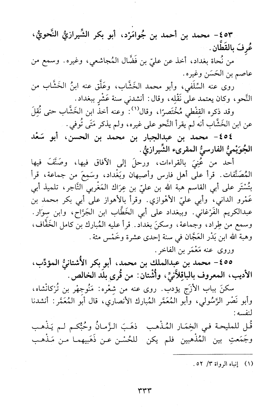453 - محمد بن أحمد بن جُوامَرْد، أبو بكر الشِّيرازيُّ النَّحويُّ عُرِفَ بالقطَّان. [الوفاة: 511 - 520 هـ]
