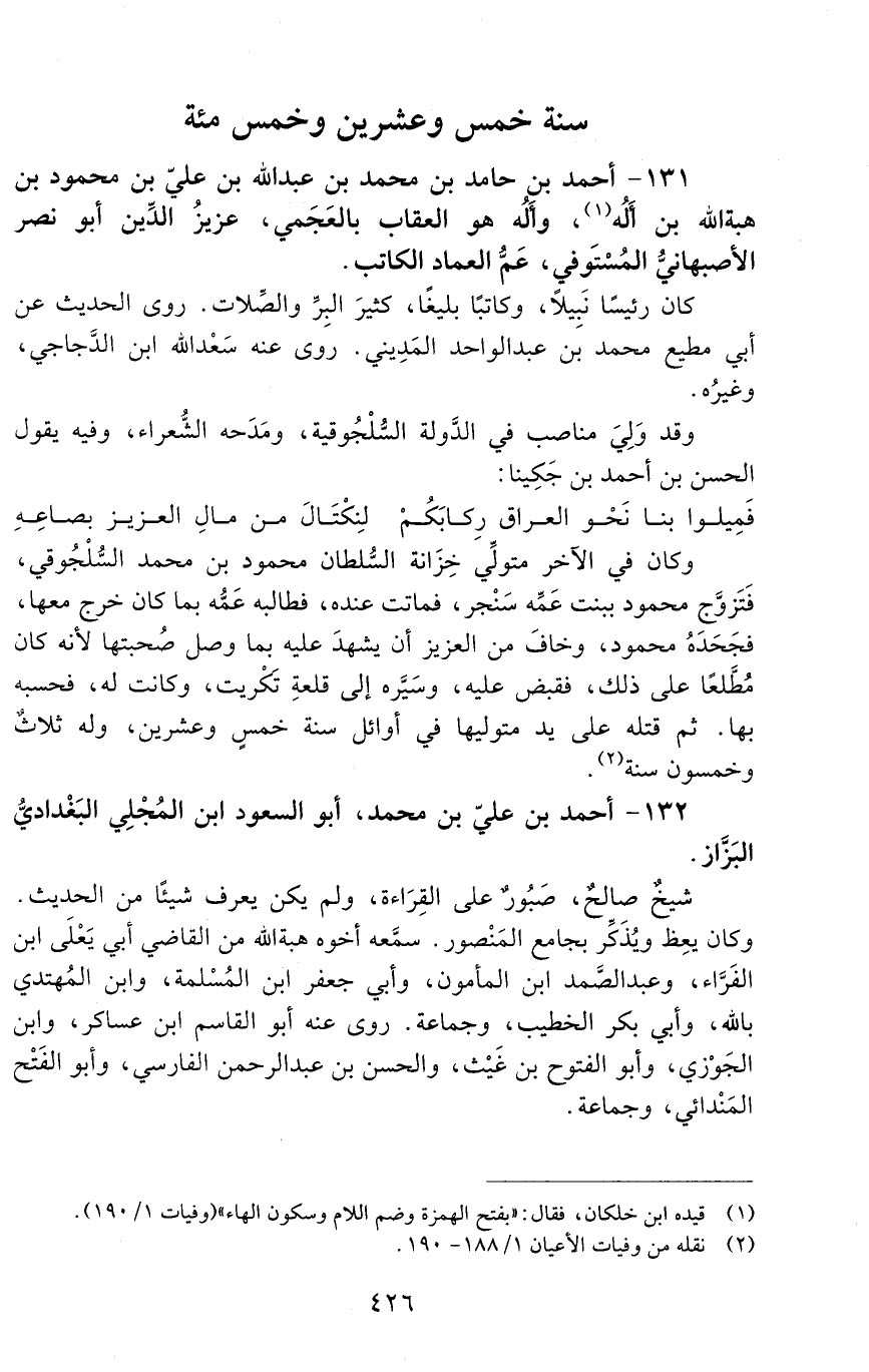 131 - أحمد بن حامد بْن مُحَمَّد بْن عَبْد اللَّه بْن عَلِيّ بن محمود بن هبة الله بن آله، وآله هو العقاب بالعجميّ، عزيز الدّين أبو نصر الأصبهانيّ المستوفيّ، [المتوفى: 525 هـ]