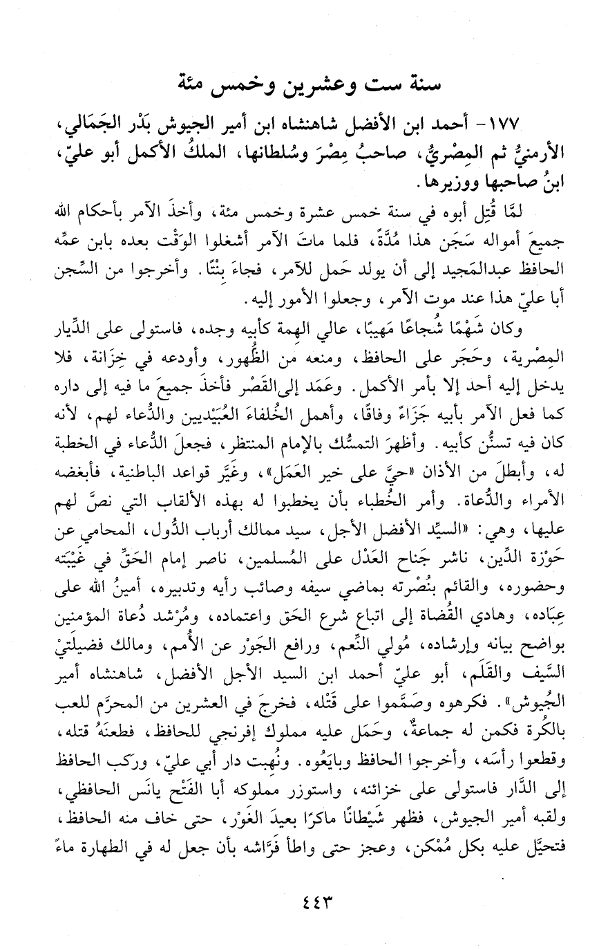 177 - أحمد ابن الأفضل شاهنشاه ابن أمير الجيوش بدر الجماليّ، الأرمنيّ، ثمّ المصريّ، صاحب مصر وسلطانها، الملك الأكمل أبو عليّ، [المتوفى: 526 هـ]