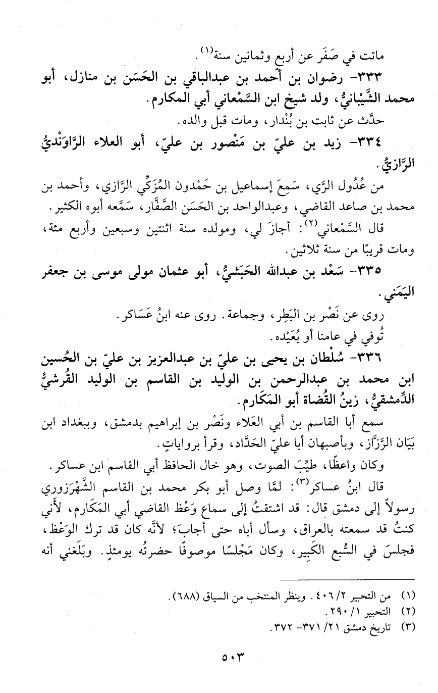 336 - سلطان بن يحيى بن عليّ بن عبد العزيز بْن عَلِيّ بْن الْحَسَين بْن مُحَمَّد بْن عبد الرحمن بن الوليد بن القاسم بن الوليد القرشيُّ الدِّمشقيُّ، زين القضاة أبو المكارم. [المتوفى: 530 هـ]