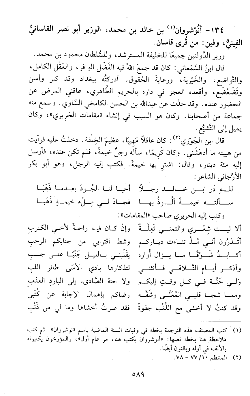 134 - أنوشروان بن خالد بن محمد، الوزير، أبو نصر القاساني، الفيني، [المتوفى: 533 هـ]