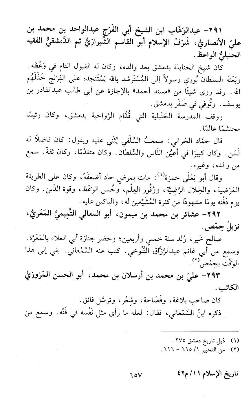 291 - عبد الوهّاب ابن الشَيخ أبي الفَرَج عبد الواحد بن محمد بن عليّ الأنصاريّ، شَرَفُ الإسلام، أبو القاسم الشّيرازيّ، ثمّ الدّمشقيّ، الفقيه، الحنبليّ، الواعظ. [المتوفى: 536 هـ]