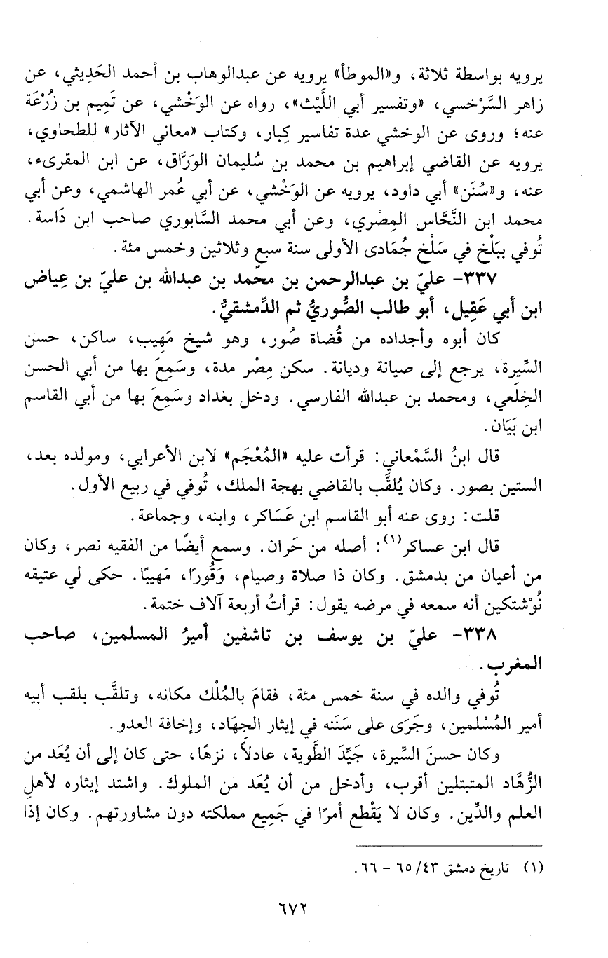 337 - عليّ بن عَبْدُ الرَّحْمَنِ بْنُ مُحَمَّدِ بْنِ عَبْدِ اللَّهِ بن علي بن عياض ابن أبي عَقِيل، أبو طالب الصُّوريّ، ثمّ الدمشقيّ. [المتوفى: 537 هـ]