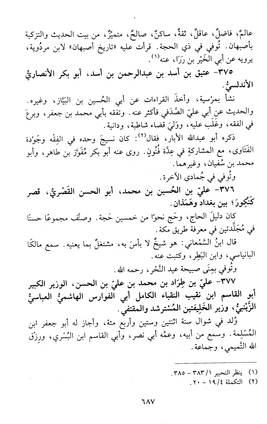377 - عليّ بن طِراد بن محمد بن عليّ بن الحَسَن، الوزير الكبير، أبو القاسم ابن نقيب النّقباء الكامل أبي الفوارس الهاشميّ، العبّاسيّ، الزَّيْنبيّ، [المتوفى: 538 هـ]