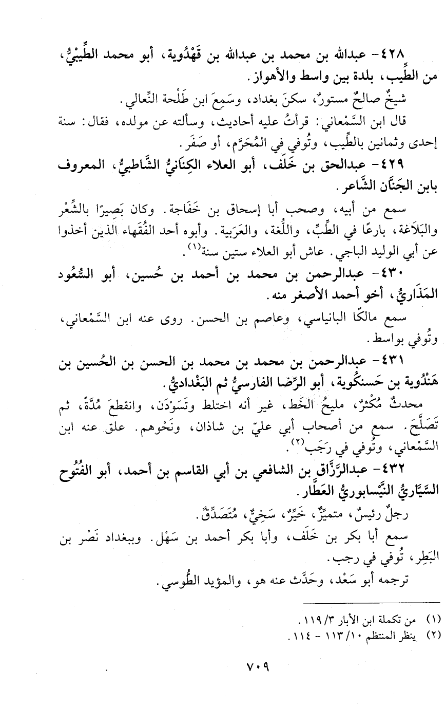 431 - عَبْد الرَّحْمَن بْن محمد بْن محمد بْن الحَسَن بن الحسين بن هنْدُوَيْه بن حَسَنْكُوَيْه، أبو الرِّضا الفارسيّ، ثمّ البغداديّ. [المتوفى: 539 هـ]