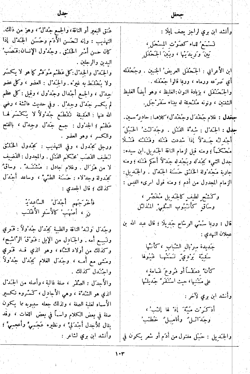 جدل: الجَدْل: شِدَّة الفَتْل. وجَدَلْتُ الحَبْلَ أَجْدِلُه جَدْلًا إِذا شَدَدْتَ فَتْله وفَتَلْتَه فَتْلًا مُحْكَماً؛ وَمِنْهُ قِيلَ لِزِمَامِ النَّاقَةِ الجَدِيل. ابْنُ سِيدَهْ: جَدَلَ الشيءَ يَجْدُلُهُ ويَجْدِلُهُ جَدْلًا أَحكم فَتْله؛ وَمِنْهُ جَارِيَةٌ مَجْدُولة الخَلْق حَسَنة الجَدْل. والجَدِيل: الزِّمَامُ الْمَجْدُولُ مِنْ أَدم؛ وَمِنْهُ قَوْلُ امْرِئِ الْقَيْسِ: