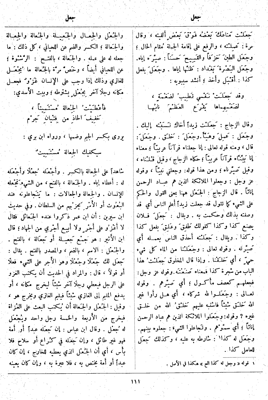 وَقَالَ الزَّجَّاجُ: جَعَلْت زَيْدًا أَخاك نَسَبْته إِليك. وجَعَل: عَمِلَ وهَيَّأَ. وجَعَلَ: خَلَق. وجَعَلَ: قَالَ، وَمِنْهُ قَوْلُهُ تَعَالَى: إِنَّا جَعَلْناهُ قُرْآناً عَرَبِيًّا