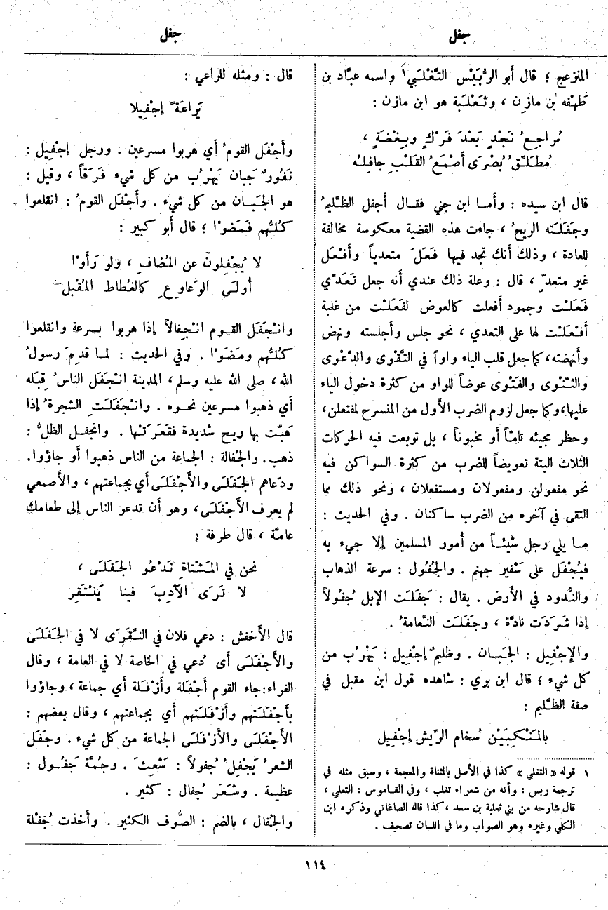 قَالَ الأَخفش: دُعِيَ فُلَانٌ فِي النَّقَرَى لَا فِي الجَفَلَى والأَجْفَلَى أَي دُعي فِي الْخَاصَّةِ لَا فِي الْعَامَّةِ، وَقَالَ الْفَرَّاءُ: جَاءَ الْقَوْمُ أَجْفَلَة وأَزْفَلة أَي جماعة، وجاؤوا بأَجْفَلَتهم وأَزْفَلَتهم أَي بِجَمَاعَتِهِمْ، وَقَالَ بَعْضُهُمْ: الأَجْفَلَى والأَزْفَلَى الْجَمَاعَةُ مِنْ كُلِّ شَيْءٍ. وجَفَل الشعرُ يَجْفِلُ جُفُولًا: شَعِثَ. وجُمَّة جَفُول: عَظِيمَةٌ. وشَعَر جُفَال: كَثِيرٌ. والجُفَال، بِالضَّمِّ: الصُّوف الْكَثِيرُ. وأَخذت جُفْلَة