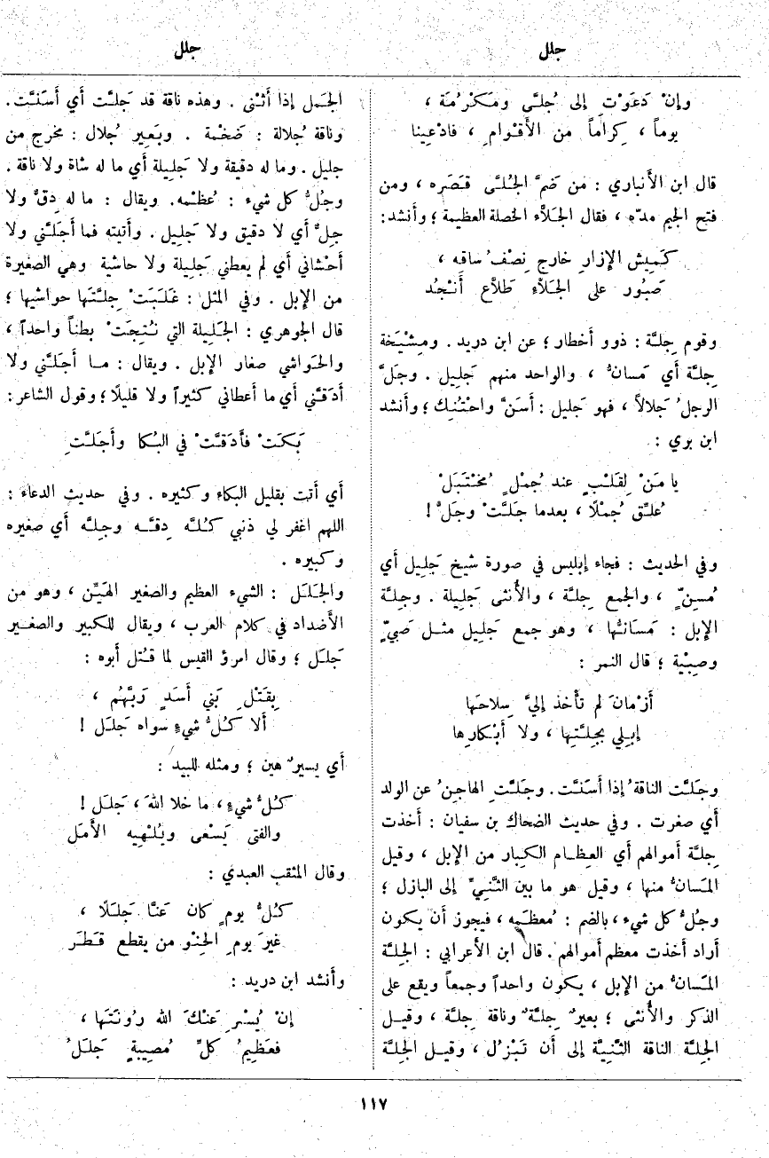 أَي العِظام الكِبار مِنَ الإِبل، وَقِيلَ المَسانُّ مِنْهَا، وَقِيلَ هُوَ مَا بَيْنَ الثَّنِيِّ إِلى الْبَازِلِ؛ وجُلُّ كُلِّ شَيْءٍ، بِالضَّمِّ: مُعْظَمه، فَيَجُوزُ أَن يَكُونَ أَراد أَخذت مُعْظَمَ أَموالهم. قَالَ ابْنُ الأَعرابي: الجِلَّة المَسانُّ مِنَ الإِبل، يَكُونُ وَاحِدًا وَجَمْعًا وَيَقَعُ عَلَى الذَّكَرِ والأُنثى؛ بعيرٌ جِلَّةٌ وَنَاقَةٌ جِلَّة، وَقِيلَ الجِلَّة النَّاقَةُ الثَّنِيَّة إِلى أَن تَبْزُل، وَقِيلَ الجِلَّة الجَمل إِذا أَثْنى. وَهَذِهِ نَاقَةٌ قَدْ جَلَّت أَي أَسَنَّت. وَنَاقَةُ جُلالة: ضَخْمة. وبَعِير جُلال: مُخْرَجٌ مِنْ جَلِيلٍ. وَمَا لَهُ دَقِيقَةٌ وَلَا جَلِيلة أَي مَا لَهُ شَاةٌ وَلَا نَاقَةٌ. وجُلُّ كُلِّ شَيْءٍ: عُظْمه. وَيُقَالُ: مَا لَهُ دِقٌّ وَلَا جِلٌّ أَي لَا دَقِيقٌ وَلَا جَلِيل. وأَتيته فَمَا أَجَلَّنِي وَلَا أَحْشاني أَي لَمْ يُعْطِنِي جَلِيلة وَلَا حَاشِيَةً وَهِيَ الصَّغِيرَةُ مِنَ الإِبل. وَفِي الْمَثَلِ: غَلَبَتْ جِلَّتَها حَوَاشِيهَا؛ قَالَ الْجَوْهَرِيُّ: الجَلِيلة الَّتِي نُتِجَتْ بَطْنًا وَاحِدًا، والحَواشي صِغَارُ الإِبل. وَيُقَالُ: مَا أَجَلَّنِي وَلَا أَدَقَّني أَي مَا أَعطاني كَثِيرًا وَلَا قَلِيلًا؛ وَقَوْلُ الشَّاعِرِ: