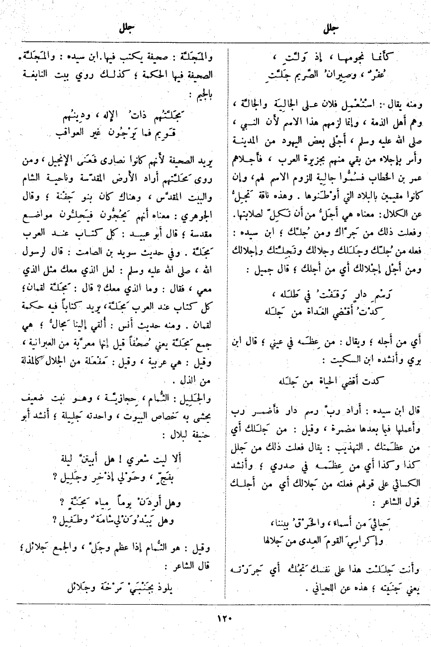 ؛ هِيَ جَمْعُ مَجَلَّة يَعْنِي صُحُفاً قِيلَ إِنها معرَّبة مِنَ الْعِبْرَانِيَّةِ، وَقِيلَ: هِيَ عَرَبِيَّةٌ، وَقِيلَ: مَفْعَلة مِنَ الْجَلَالِ كَالْمَذَلَّةِ مِنَ الذُّلِّ. والجَلِيل: الثُّمام، حِجازيَّة، وَهُوَ نَبْتٌ ضَعِيفٌ يُحْشَى بِهِ خَصاص الْبُيُوتِ، وَاحِدَتُهُ جَلِيلة؛ أَنشد أَبو حَنِيفَةَ لِبِلَالٍ: