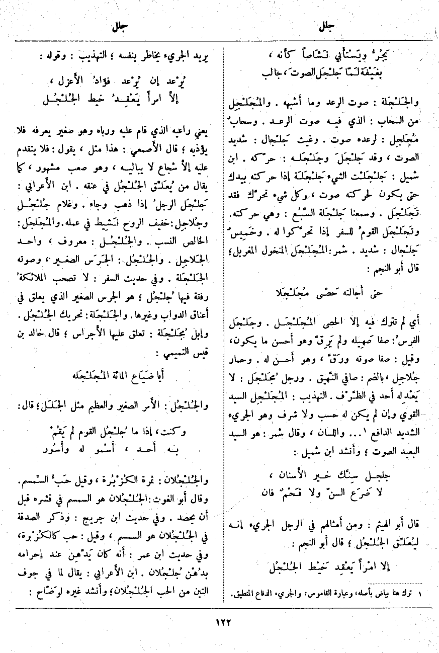 أَي لَمْ تَتْرُكْ فِيهِ إِلا الْحَصَى المُجَلْجَل. وجَلْجَلَ الفرسُ: صَفَا صَهِيله وَلَمْ يَرِقَّ وَهُوَ أَحسن مَا يَكُونُ، وَقِيلَ: صَفَا صَوْتُهُ ورَقَّ، وَهُوَ أَحسن لَهُ. وَحِمَارٌ جُلاجِل، بِالضَّمِّ: صَافِي النَّهيق. وَرَجُلٌ مُجَلْجَل: لَا يَعْدِله أَحد فِي الظَّرْف. التَّهْذِيبُ: المُجَلْجِل السَّيِّدُ الْقَوِيُّ وإِن لَمْ يَكُنْ لَهُ حَسَبٌ وَلَا شَرَفٌ وَهُوَ الْجَرِيءُ الشَّدِيدُ الدَّافِعُ «1» ... وَاللِّسَانُ، وَقَالَ شِمْرٌ: هُوَ السَّيِّدُ الْبَعِيدُ الصَّوْتِ؛ وأَنشد ابْنُ شُمَيْلٍ: