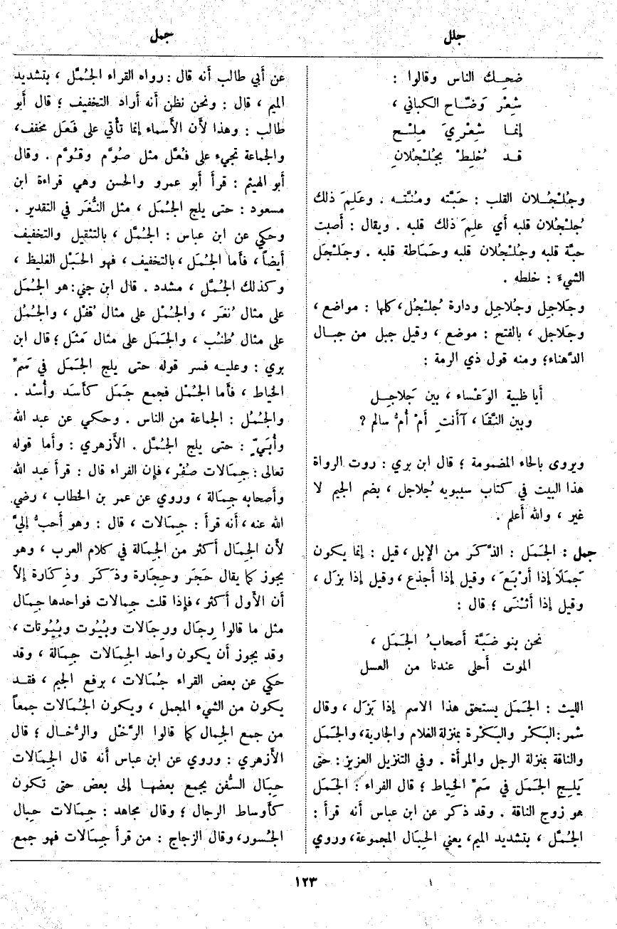 الأَزهري: وأَما قَوْلُهُ تَعَالَى: جِمَالات صُفْر، فإِن الْفَرَّاءَ قَالَ: قرأَ عَبْدُ اللَّهِ وأَصحابه جِمالَتٌ