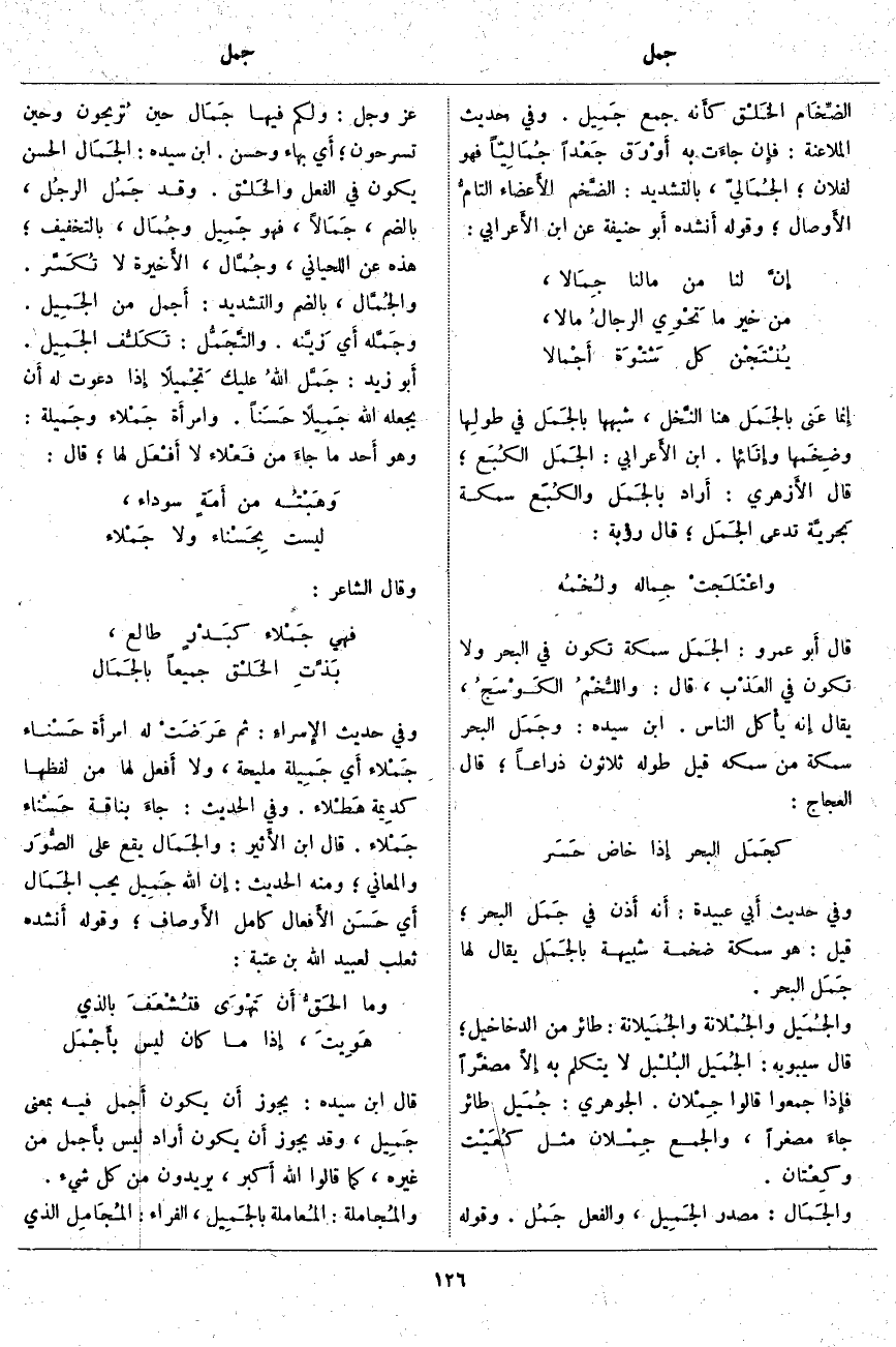 قَالَ ابْنُ الأَثير: والجَمَال يَقَعُ عَلَى الصُّوَر وَالْمَعَانِي؛ وَمِنْهُ الْحَدِيثُ: