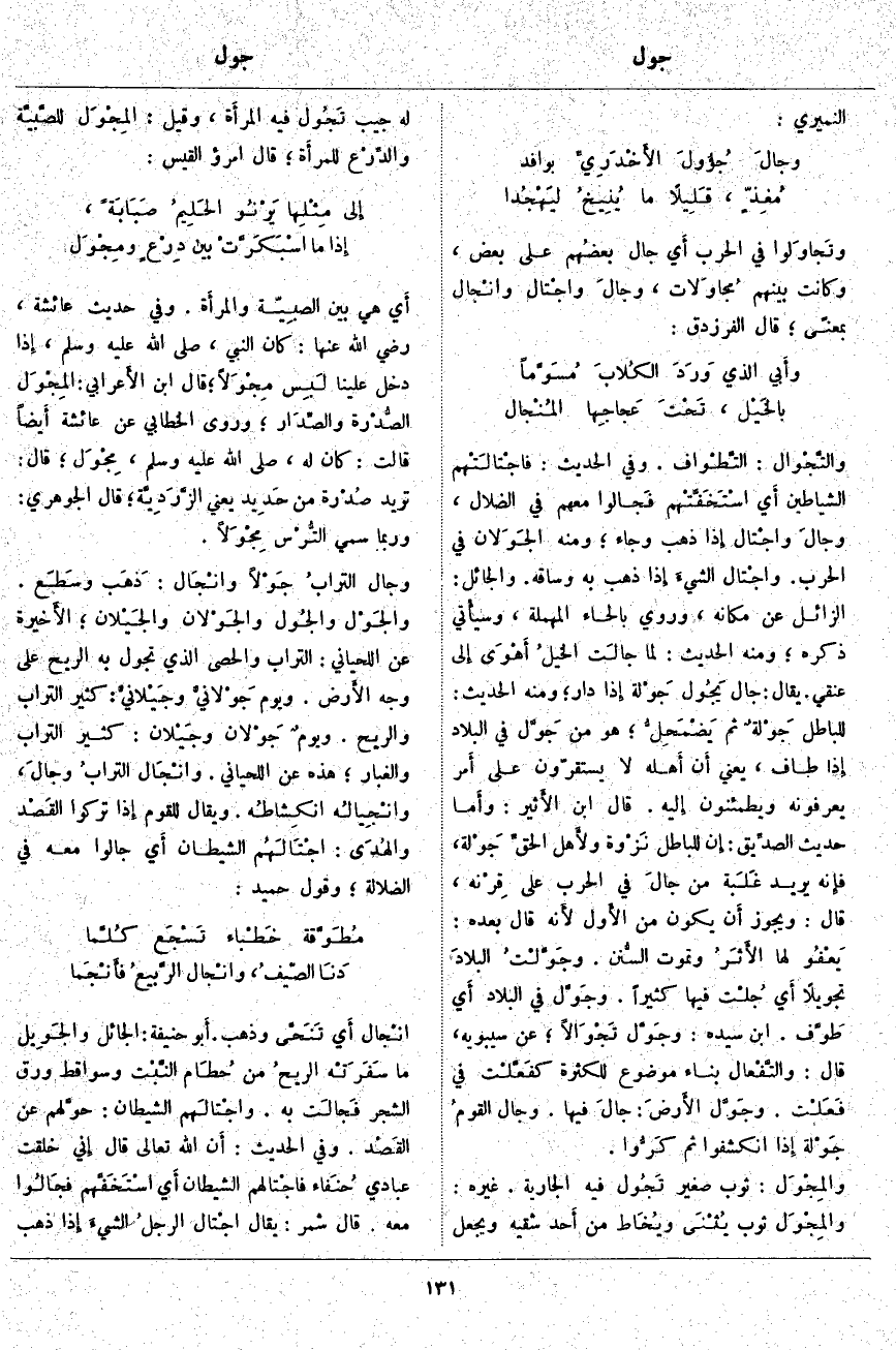 ؛ قَالَ: تُرِيدُ صُدْرة مِنْ حَدِيد يَعْنِي الزَّرَدِيَّة؛ قَالَ الْجَوْهَرِيُّ: وَرُبَّمَا سُمِّيَ التُّرْس مِجْوَلًا. وجَالَ الترابُ جَوْلًا وانْجَال: ذَهَب وسَطَع. والجَوْل والجُول والجَوْلان والجَيْلان؛ الأَخيرة عَنِ اللِّحْيَانِيِّ: التُّرَابُ وَالْحَصَى الَّذِي تَجُولُ بِهِ الرِّيحُ عَلَى وَجْهِ الأَرض. وَيَوْمٌ جَوْلانيٌّ وجَيْلانيٌّ: كَثِيرُ التُّرَابِ وَالرِّيحِ. ويومٌ جَوْلان وجَيْلان: كَثِيرُ التُّرَابِ وَالْغُبَارِ؛ هَذِهِ عَنِ اللِّحْيَانِيِّ. وانْجَال الترابُ وجالَ، وانْجِيالُه انكِشاطُه. وَيُقَالُ لِلْقَوْمِ إِذا تَرَكُوا القَصْد والهُدَى: اجْتَالَهُم الشَّيْطَانُ أَي جَالُوا مَعَهُ فِي الضَّلَالَةِ؛ وَقَوْلُ حُمَيْدٍ: