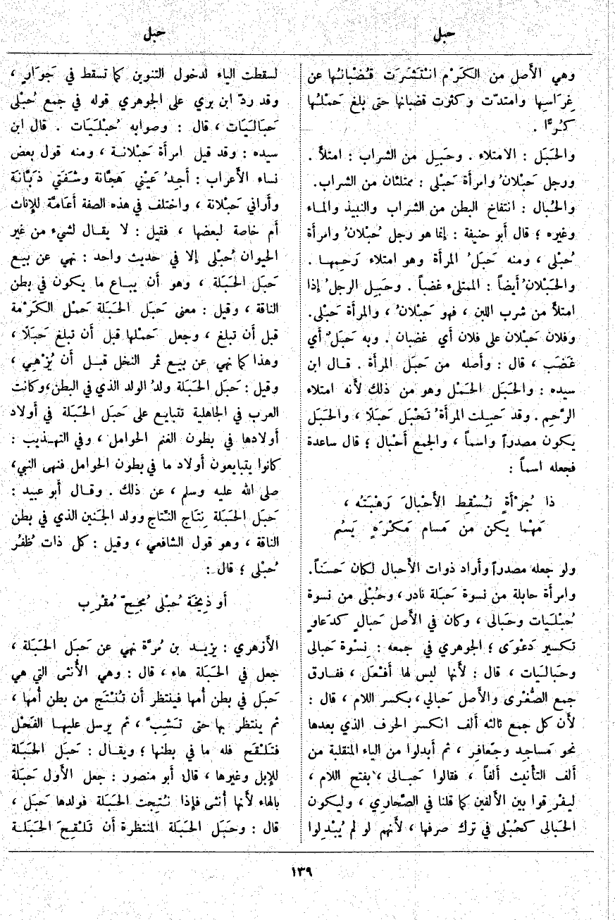 وَلَوْ جَعَلَهُ مَصْدَرًا وأَراد ذَوَاتَ الأَحْبَال لَكَانَ حَسَناً. وامرأَة حَابِلَةٌ مِنْ نِسْوَةٍ حَبَلة نَادِرٌ، وحُبْلى مِنْ نِسْوَةٍ حُبْلَيات وحَبالى، وَكَانَ فِي الأَصل حَبالٍ كدَعاوٍ تَكْسِيرُ دَعْوَى؛ الْجَوْهَرِيُّ فِي جَمْعِهِ: نِسْوة حَبالى وحَبالَيات، قَالَ: لأَنها لَيْسَ لَهَا أَفْعَل، فَفَارَقَ جَمْعَ الصُّغْرى والأَصل حَبالي، بِكَسْرِ اللَّامِ، قَالَ: لأَن كُلَّ جَمْعٍ ثَالِثُهُ أَلف انْكَسَرَ الْحَرْفُ الَّذِي بَعْدَهَا نَحْوَ مَساجِد وجَعافِر، ثُمَّ أَبدلوا مِنَ الْيَاءِ الْمُنْقَلِبَةِ مِنْ أَلف التأْنيث أَلفاً، فَقَالُوا حَبالى، بِفَتْحِ اللَّامِ، ليفْرِقوا بَيْنَ الأَلفين كَمَا قُلْنَا فِي الصَّحارِي، وَلِيَكُونَ الحَبالى كحُبْلى فِي تَرْكِ صَرْفِهَا، لأَنهم لَوْ لَمْ يُبْدِلوا لَسَقَطَتِ الْيَاءُ لِدُخُولِ التَّنْوِينِ كَمَا تَسْقُطُ فِي جَوَارٍ، وَقَدْ رَدَّ ابْنُ بَرِّيٍّ عَلَى الْجَوْهَرِيِّ قَوْلَهُ فِي جَمْعِ حُبْلى حَبَالَيَات، قَالَ: وَصَوَابُهُ حُبْلَيَات. قَالَ ابْنُ سِيدَهْ: وَقَدْ قِيلَ امرأَة حَبْلانة، وَمِنْهُ قَوْلُ بَعْضِ نِسَاءِ الأَعراب: أَجِدُ عَيْني هَجَّانة وشَفَتي ذَبَّانَة وأَراني حَبْلانة، وَاخْتُلِفَ فِي هَذِهِ الصِّفَةِ أَعَامَّة للإِناث أَم خَاصَّةٌ لِبَعْضِهَا، فَقِيلَ: لَا يُقَالُ لِشَيْءٍ مِنْ غَيْرِ الْحَيَوَانِ حُبْلى إِلا فِي حَدِيثٍ وَاحِدٍ: