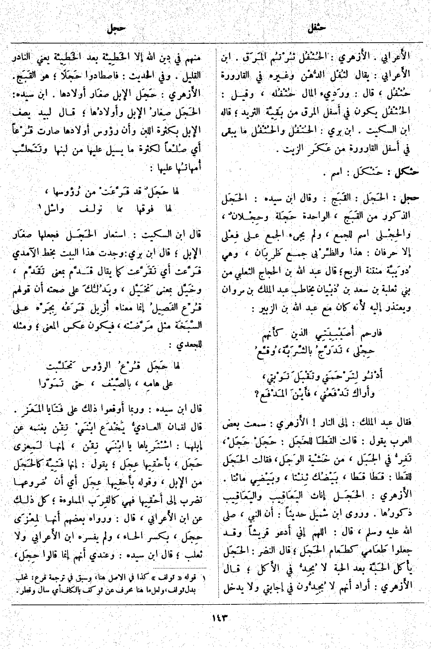 قَالَ ابْنُ سِيدَهْ: وَرُبَّمَا أَوقعوا ذَلِكَ عَلَى فَتَايا المَعَزِ. قَالَ لُقْمَانُ العاديُّ يَخْدَع ابْنَيْ تِقْن بِغَنَمِهِ عَنْ إِبلهما: اشْتَرِياها يَا ابْنَي تِقْن، إِنها لَمِعزى حَجَل، بأَحْقِيها عِجَل؛ يَقُولُ: إِنَّهَا فَتِيَّة كالحَجَل مِنَ الإِبل، وَقَوْلُهُ بأَحقِيها عِجَل أَي أَن ضُروعها تَضْرِبُ إِلى أَحْقِيها فَهِيَ كالقِرَب الْمَمْلُوءَةِ؛ كُلُّ ذَلِكَ عَنِ ابْنِ الأَعرابي، قَالَ: وَرَوَاهُ بَعْضُهُمْ أَنها لمِعْزَى حِجَل، بِكَسْرِ الْحَاءِ، وَلَمْ يُفَسِّرْهُ ابْنُ الأَعرابي وَلَا ثَعْلَبٌ؛ قَالَ ابْنُ سِيدَهْ: وَعِنْدِي أَنهم إِنما قالوا حِجَل،